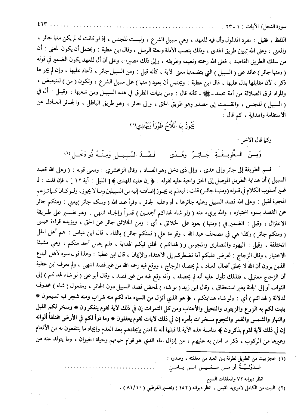 اللفظ . فقيل : مفرد المدلول ، وأل فيه للعهد ، وهي سبيل الشرع ، وليست للجنس ، إذ لو كانت له لم يكن منها جائز . والمعنى : وعلى الله تبين طريق الهدى ، وذلك بنصب الأدلة وبعثة الرسل . وقال ابن عطية : ويحتمل أن يكون المعنى : إنّ من سلك الطريق القاصد فعلى الله رحمته ونعيمه وطريقه ، وإلى ذلك مصيره . وعلى أنّ للعهد يكون الضمير في قوله : ومنها جائز ، عائد على السبيل التي يتضمنها معنى الآية ، كأنه قيل : ومن السبيل جائر ، فأعاد عليها وإن لم يجر لها ذكر ، لأنّ مقابلها يدل عليها . قال ابن عطية : ويحتمل أن يعود منها على سبيل الشرع ، وتكون مِن للتبعيض ، والمراد : فرق الضلالة من أمة محمد ( صلى الله عليه وسلم ) ) . كأنه قال : ومن بنيات الطرق في هذه السبيل ، ومن شعبها . وقيل : أل في السبيل للجنس ، وانقسمت إلى مصدر وهو طريق الحق ، وإلى جائر وهو طريق الباطل ، والجائر العادل عن الاستقامة والهداية كما قال :
