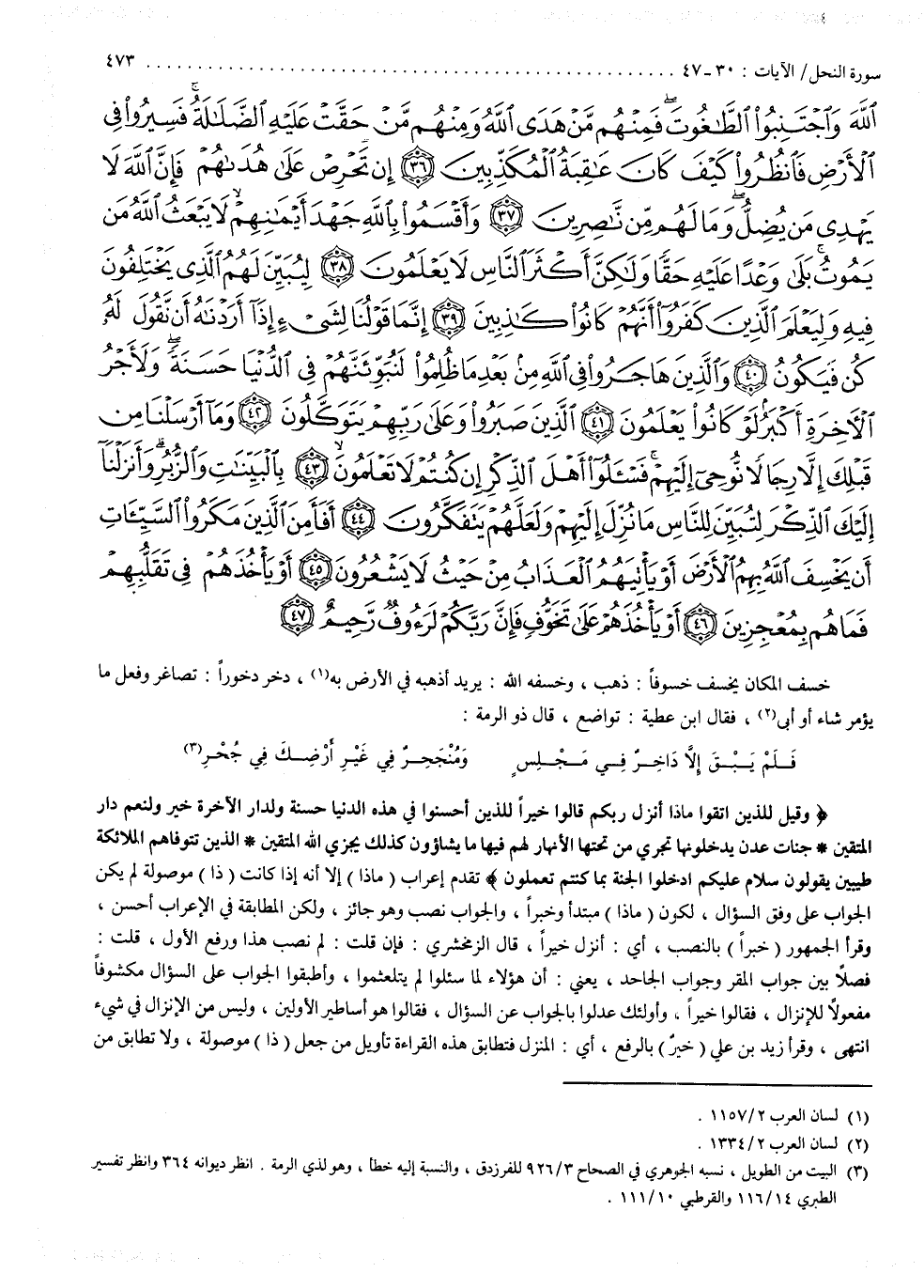اللَّهَ وَاجْتَنِبُواْ الْطَّاغُوتَ فَمِنْهُم مَّنْ هَدَى اللَّهُ وَمِنْهُمْ مَّنْ حَقَّتْ عَلَيْهِ الضَّلَالَةُ فَسِيرُواْ فِى الاٌّ رْضِ فَانظُرُواْ كَيْفَ كَانَ عَاقِبَةُ الْمُكَذِّبِينَ إِن تَحْرِصْ عَلَى هُدَاهُمْ فَإِنَّ اللَّهَ لاَ يَهْدِى مَن يُضِلُّ وَمَا لَهُمْ مِّن نَّاصِرِينَ وَأَقْسَمُواْ بِاللَّهِ جَهْدَ أَيْمَانِهِمْ لاَ يَبْعَثُ اللَّهُ مَن يَمُوتُ بَلَى وَعْدًا عَلَيْهِ حَقًّا وَلَاكِنَّ أَكْثَرَ الْنَّاسِ لاَ يَعْلَمُونَ لِيُبَيِّنَ لَهُمُ الَّذِى يَخْتَلِفُونَ فِيهِ وَلِيَعْلَمَ الَّذِينَ كَفَرُواْ أَنَّهُمْ كَانُواْ كَاذِبِينَ إِنَّمَا قَوْلُنَا لِشَىْءٍ إِذَآ أَرَدْنَاهُ أَن نَّقُولَ لَهُ كُنْ فَيَكُونُ وَالَّذِينَ هَاجَرُواْ فِى اللَّهِ مِنْ بَعْدِ مَا ظُلِمُواْ لَنُبَوِّئَنَّهُمْ فِى الدُّنْيَا حَسَنَة وَلاّجْرُ الاٌّ خِرَةِ أَكْبَرُ لَوْ كَانُواْ يَعْلَمُونَ الَّذِينَ صَبَرُواْ وَعَلَى رَبِّهِمْ يَتَوَكَّلُونَ وَمَآ أَرْسَلْنَا مِن قَبْلِكَ إِلاَّ رِجَالاً نُّوحِىإِلَيْهِمْ فَاسْأَلُواْ أَهْلَ الذِّكْرِ إِن كُنْتُم لاَ تَعْلَمُونَ بِالْبَيِّنَاتِ وَالزُّبُرِ وَأَنزَلْنَا إِلَيْكَ الذِّكْرَ لِتُبَيِّنَ لِلنَّاسِ مَا نُزِّلَ إِلَيْهِمْ وَلَعَلَّهُمْ يَتَفَكَّرُونَ أَفَأَمِنَ الَّذِينَ مَكَرُواْ السَّيِّئَاتِ أَن يَخْسِفَ اللَّهُ بِهِمُ الاٌّ رْضَ أَوْ يَأْتِيَهُمُ الْعَذَابُ مِنْ حَيْثُ لاَ يَشْعُرُونَ أَوْ يَأْخُذَهُمْ فِى تَقَلُّبِهِمْ فَمَا هُم بِمُعْجِزِينَ أَوْ يَأْخُذَهُمْ عَلَى تَخَوُّفٍ فَإِنَّ رَبَّكُمْ لَرَؤُوفٌ رَّحِيمٌ أَوَ لَمْ يَرَوْاْ إِلَى مَا خَلَقَ اللَّهُ مِن شَىْءٍ يَتَفَيَّأُ ظِلَالُهُ عَنِ الْيَمِينِ وَالْشَّمَآئِلِ سُجَّدًا لِلَّهِ وَهُمْ دَاخِرُونَ وَلِلَّهِ يَسْجُدُ مَا فِى السَّمَاوَاتِ وَمَا فِى الاٌّ رْضِ مِن دَآبَّةٍ وَالْمَلَائِكَةُ وَهُمْ لاَ يَسْتَكْبِرُونَ يَخَافُونَ رَبَّهُمْ مِّن فَوْقِهِمْ وَيَفْعَلُونَ مَا يُؤْمَرُونَ ( )