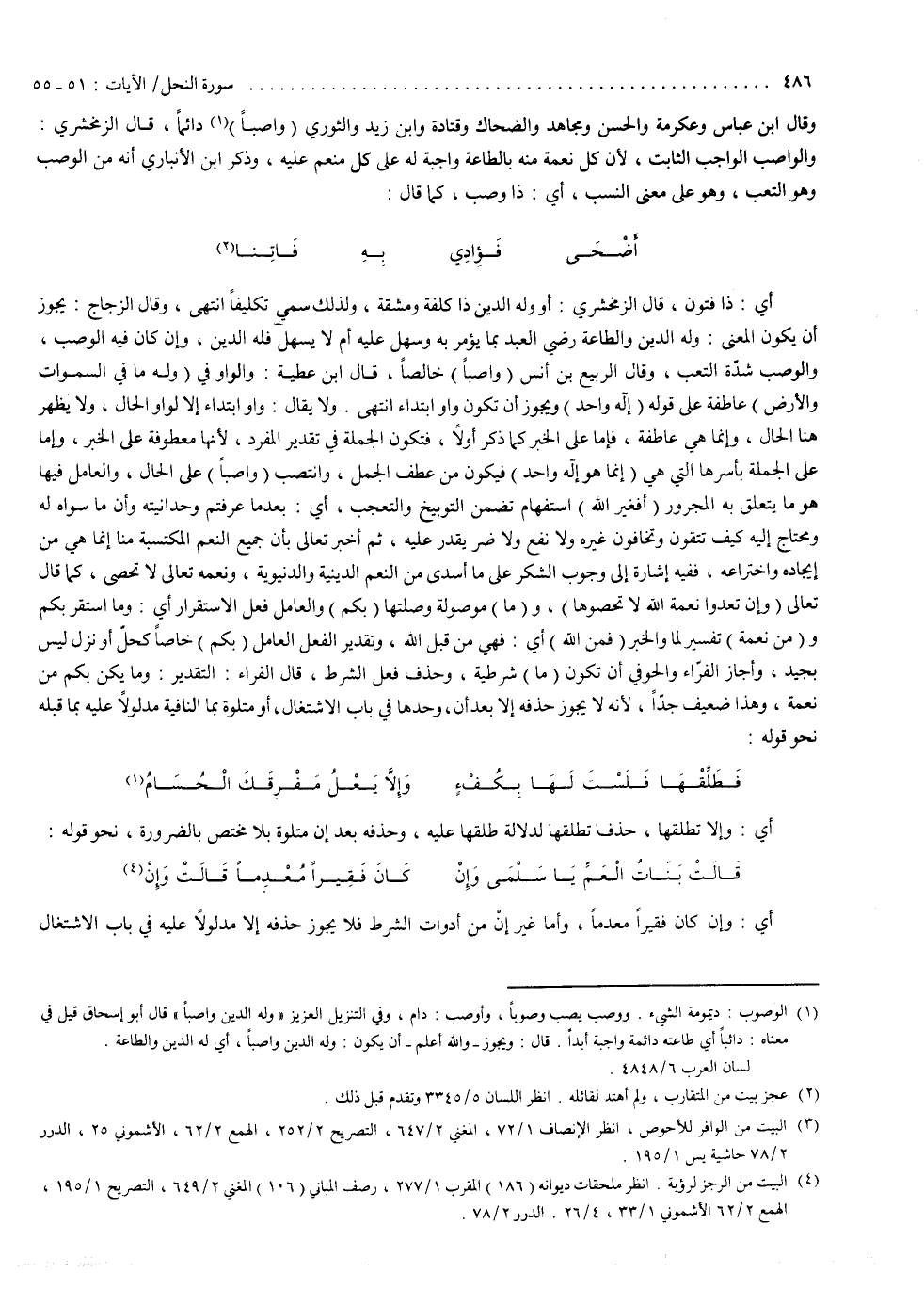 وقال ابن عباس ، وعكرمة ، والحسن ، ومجاهد ، والضحاك ، وقتادة ، وابن زيد ، والثوري : واصباً دائماً . قال الزمخشري : والواصب الواجب الثابت لأن كل نعمة منه بالطاعة واجبة له على كل منعم عليه ، وذكر ابن الأنباري أنه من الوصب وهو التعب ، وهو على معنى النسب أي : ذا وصب ، كما قال : أضحى فؤادي به فاتناً ، أي ذا فتون . قال الزمخشري : أو وله الدين ذا كلفة ومشقة ، ولذلك سمى تكليفاً انتهى . وقال الزجاج : يجوز أن يكون المعنى : وله الدين والطاعة رضي العبد بما يؤمر به وسهل عليه أم لا يسهل فله الدين ، وإن كان فيه الوصب . والوصب : شدّة التعب . وقال الربيع بن أنس : واصباً خالصاً . قال ابن عطية : والواو في وله ما في السموات والأرض عاطفة على قوله : إله واحد ، ويجوز أن تكون واو ابتداء انتهى . ولا يقال واو ابتداء إلا لواو الحال ، ولا يظهر هنا الحال ، وإنما هي عاطفة : فإما على الخبر كما ذكر أولاً فتكون الجملة في تقدير المفرد لأنها معطوفة على الخبر ، وإما على الجملة بأسرها التي هي : إنما هو إله واحد ، فيكون من عطف الجمل . وانتصب واصباً على الحال ، والعامل فيها هو ما يتعلق به المجرور . أفغير الله استفهام تضمن التوبيخ والتعجب أي : بعدما عرفتم وحدانيته ، وأن ما سواه له ومحتاج إليه ، كيف تتقون وتخافون غيره ولا نفع ولا ضر يقدر عليه ؟ ثم أخبر تعالى بأنّ جميع النعم المكتسبة منا إنما هي من إيجاده واختراعه ، ففيه إشارة إلى وجوب الشكر على ما أسدى من النعم الدينية والدنيوية . ونعمه تعالى لا تحصى كما قال تعالى : ) وَإِن تَعُدُّواْ نِعْمَةَ اللَّهِ لاَ تُحْصُوهَا ). وما موصولة ، وصلتها بكم ، والعامل فعل الاستقرار أي : وما استقر بكم ، ومن نعمة تفسير لما ، والخبر فمن الله أي : فهي من قبل الله ، وتقدير الفعل العامل بكم خاصاً كحلّ أو نزل ليس بجيد . وأجاز الفرّاء والحوفي : أن تكون ما شرطية ، وحذف فعل الشرط . قال الفراء : التقدير . وما يكن بكم من نعمة ، وهذا ضعيف جداً لأنه لا يجوز حذفه إلا بعد أن وحدها في باب الاشتغال ، أو متلوة بما النافية مدلولاً عليه بما قبله ، نحو قوله : فطلقها فلست لها بكفء