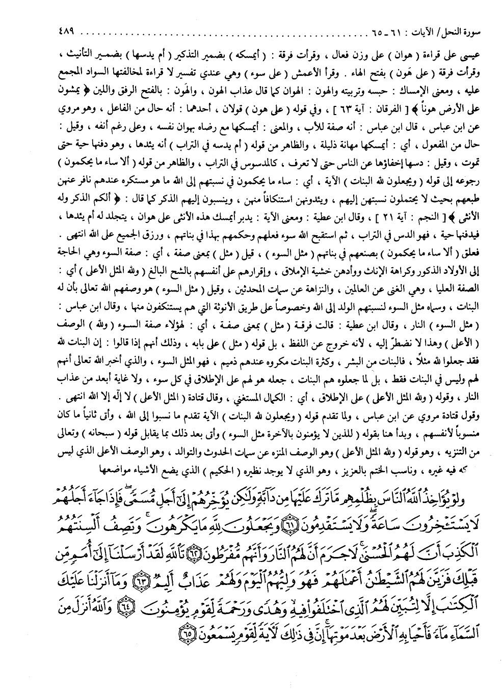 عيسى على قراءة هوان على وزن فعال . وقرأت فرقة : أيمسكه بضمير التذكير ، أم يدسها بضمير التأنيث . وقرأت فرقة : على هون بفتح الهاء . وقرأ الأعمش : على سوء ، وهي عندي تفسير لا قراءة ، لمخالفتها السواد المجمع عليه . ومعنى الإمساك حبسه وتربيته ، والهون الهوان كما قال : ) عَذَابَ الْهُونِ ( والهون بالفتح الرفق واللبن ، ( يَمْشُونَ عَلَى الاْرْضِ هَوْناً ( وفي قوله : على هون قولان : أحدهما : أنه حال من الفاعل ، وهو مروي عن ابن عباس . قال ابن عباس : إنه صفة للأب ، والمعنى : أيمسكها مع رضاه بهوان نفسه ، وعلى رغم أنفه ؟ وقيل : حال من المفعول أي : أيمسكها مهانة ذليلة ، والظاهر من قوله : أم يدسه في التراب ، إنه يئدها وهو دفنها حية حتى تموت . وقيل : دسها إخفاؤها عن الناس حتى لا تعرف كالمدسوس في التراب . والظاهر من قوله : ألا ساء ما يحكمون ، رجوعه إلى قوله : ويجعلون لله البنات الآية أي : ساء ما يحكمون في نسبتهم إلى الله ما هو مستكره عندهم ، نافر عنهن طبعهم ، بحيث لا يحتملون نسبتهن إليهن ، ويئدونهن استنكافاً منهن ، وينسبون إليهم الذكر كما قال : ) أَلَكُمُ الذَّكَرُ وَلَهُ الاْنثَى ( وقال ابن عطية : ومعنى الآية يدبر أيمسك هذه الأنثى على هوان يتجلد له ، أم يئدها فيدفنها حية فهو الدس في التراب ؟ ثم استقبح الله سوء فعلهم وحكمهم بهذا في بناتهم ورزق الجميع على الله انتهى . فعلق ألا ساء ما يحكمون بصنعهم في بناتهم مثل السوء . قيل : مثل بمعنى صفة أي : صفة السوء ، وهي الحاجة إلى الأولاد الذكور وكراهة الإناث ، ووأدهن خشية الإملاق وإقرارهم على أنفسهم بالشح البالغ . ولله المثل الأعلى أي : الصفة العليا ، وهي الغنى عن العالمين ، والنزاهة عن سمات المحدثين . وقيل : مثل السوء هو وصفهم الله تعالى بأن له البنات ، وسماه مثل السوء لنسبتهم الولد إلى الله ، وخصوصاً على طريق الأنوثة التي هم يستنكفون منها . وقال ابن عباس : مثل السوء النار . وقال ابن عطية : قالت فرقة مثل بمعنى صفة أي : لهؤلاء صفة السوء ، ولله الوصف الأعلى ، وهذا لا نضطرّ إليه لأنه خروج عن اللفظ ، بل قوله : مثل ، على بابه وذلك أنهم إذا قالوا : أن البنات لله فقد جعلوا لله مثلاً ، فالبنات من البشر وكثرة البنات مكروه عندهم ذميم فهو المثل السوء . والذي أخبر الله تعالى أنهم لهم وليس في البنات فقط ، بل لما جعلوه هم البنات جعله هو هلم على الإطلاق في كل سوء ، ولا غاية أبعد من عذاب النار . وقوله : ولله المثل الأعلى ، على الإطلاق أي : الكمال المستغنى . وقال قتادة : المثل الأعلى لا إله إلا الله انتهى ، وقول قتادة مروي عن ابن عباس . ولما تقدم قوله : ويجعلون لله البنات الآية تقدم ما نسبوا إلى الله ، وأتى ثانياً ما كان منسوباً لأنفسهم ، وبدأ هنا بقوله : للذين لا يؤمنون بالآخرة مثل السوء ، وأتى بعد ذلك بما يقابل قوله : سبحانه وتعالى من التنزيه وهو قوله : ولله المثل الأعلى ، وهو الوصف المنزه عن سمات الحدوث والتوالد ، وهو الوصف الأعلى الذي ليس يشركه فيه غيره ، وناسب الختم بالعزيز وهو الذي لا يوجد نظيره ، الحكيم الذي يضع الأشياء مواضعها .
