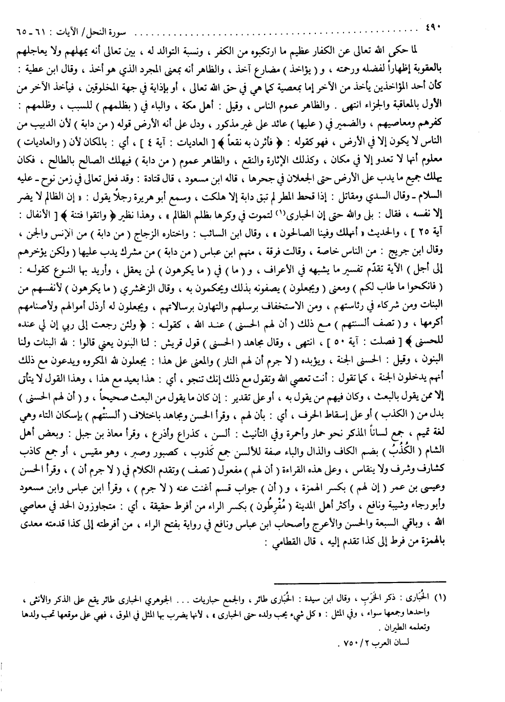 لما حكى الله تعالى عن الكفار عظيم ما ارتكبوه من الكفر ونسبة التولد له ، بيَّن تعالى أنه يمهلهم ولا يعاجلهم بالعقوبة إظهاراً لفضله ورحمته . ويؤاخذ : مضارع آخذ ، والظاهر أنه بمعنى المجرد الذي هو أخذه . وقال ابن عطية : كان أحد المؤاخذين يأخذ من الآخر ، إما بمعصية كما هي في حق الله تعالى ، أو بإذاية في جهة المخلوقين ، فيأخذ الآخر من الأول بالمعاقبة والجزاء انتهى . والظاهر : عموم الناس . وقيل : أهل مكة ، والباء في بظلمهم للسبب . وظلمهم كفرهم ومعاصيهم . والضمير في عليها عائد على غير مذكور ، ودل على أنه الأرض قوله : من دابة ، لأن الدبيب من الناس لا يكون إلا في الأرض ، فهو كقوله : ) فَأَثَرْنَ بِهِ نَقْعاً ( أي بالمكان لأن ) وَالْعَادِيَاتِ ( معلوم أنها لا تعدو إلا في مكان ، وكذلك الإثارة والنفع . والظاهر عموم من دابة فيهلك الصالح بالطالح ، فكان يهلك جميع ما يدب على الأرض حتى الجعلان في جحرها قاله : ابن مسعود . قال قتادة : وقد فعل تعالى في زمن نوح عليه السلام . وقال السدي ومقاتل : إذا قحط المطر لم تبق دابة إلا هلكت . وسمع أبو هريرة رجلاً يقول : إن الظالم لا يضر إلا نفسه ، فقال : بلى والله حتى أن الحبارى لتموت في وكرها بظلم الظالم . وهذا نظير : ) وَاتَّقُواْ فِتْنَةً ( الآية والحديث ( أنهلك وفينا الصالحون ) وقال ابن السائب ، واختاره الزجاج : من دابة من الإنس والجن . وقال ابن جريج : من الناس خاصة . وقالت فرقة منهم ابن عباس : من دابة من مشرك يدب عليها ، ولكن يؤخرهم إلى أجل الآية ، تقدّم تفسير ما يشبهه في الأعراف . وما في ما يكرهون لمن يعقل ، أريد بها النوع كقوله : ) فَانكِحُواْ مَا طَابَ لَكُمْ ( ومعنى : ويجعلون ، يصفونه بذلك ويحكمون به . وقال الزمخشري : ما يكرهون لأنفسهم من البنات ، ومن شركاء في رئاستهم ، ومن الاستخفاف برسلهم والتهاون برسالاتهم ، ويجعلون له أرذل أموالهم ، ولأصنامهم أكرمها ، وتصف ألسنتهم مع ذلك أنّ لهم الحسنى عند الله كقوله : ) وَلَئِن رُّجّعْتُ إِلَى رَبّى إِنَّ لِى عِندَهُ لَلْحُسْنَى ( انتهى .