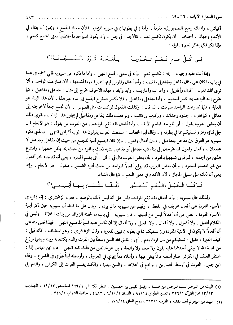 أكياش ، ولذلك رجع الضمير إليه مفرداً ، وأما في بطونها في سورة المؤمنين فلأن معناه الجمع ، ويجوز أن يقال في الأنعام وجهان : أحدهما : أن يكون تكسير نعم كالأجبال في جبل ، وأن يكون اسماً مفرداً مقتضياً لمعنى الجمع كنعم ، فإذا ذكر فكما يذكر نعم في قوله : في كل عام نعم تحوونه