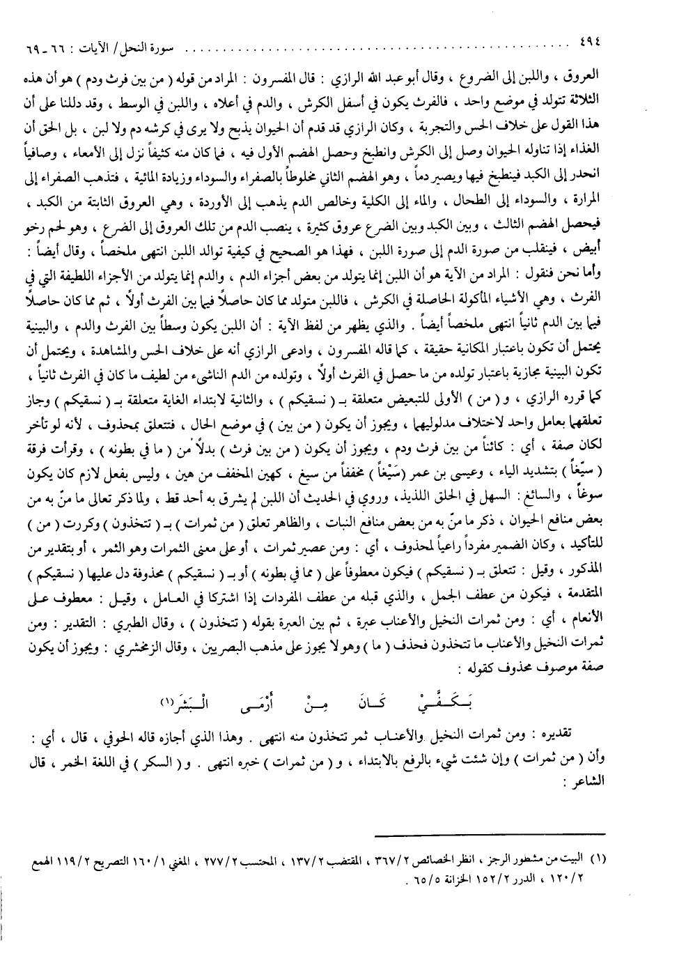 وقال أبو عبد الله الرازي : قال المفسرون : المراد من قوله من بين فرث ودم ، هو أنّ هذه الثلاثة تتولد في موضع واحد ، فالفرث يكون في أسفل الكرش ، والدم في أعلاه ، واللبن في الوسط ، وقد دللنا على أنّ هذا القول على خلاف الحس والتجربة ، وكان الرازي قد قدم أن الحيوان يذبح ولا يرى في كرشه دم ولا لبن ، بل الحق أنّ الغذاء إذا تناوله الحيوان وصل إلى الكرش وانطبخ وحصل الهضم الأول فيه ، فما كان منه كثيفاً نزل إلى الأمعاء ، وصافياً انحدر إلى الكبد فينطبخ فيها ويصير دماً ، وهو الهضم الثاني مخلوطاً بالصفراء والسوداء وزيادة المائية ، فتذهب الصفراء إلى المرارة ، والسوداء إلى الطحال ، والماء إلى الكلية ، وخالص الدم يذهب إلى الأوردة وهي العروق النابتة من الكبد فيحصل الهضم الثالث . وبين الكبد وبين الضرع عروق كثيرة ينصب الدم من تلك العروق إلى الضرع ، وهو لحم رخو أبيض فينقلب من صورة الدم إلى صورة اللبن ، فهذا هو الصحيح في كيفية توالد اللبن انتهى ملخصاً . وقال أيضاً : وأما نحن فنقول : المراد من الآية هو أنّ اللبن إنما يتولد من بعض أجزاء الدم ، والدم إنما يتولد من الأجزاء اللطيفة التي في الفرث ، وهي الأشياء المأكولة الحاصلة في الكرش . فاللبن متولد مما كان حاصلاً فيما بين الفرث أولاً ، ثم مما كان حاصلاً فيما بين الدم ثانياً انتهى ، ملخصاً أيضاً .