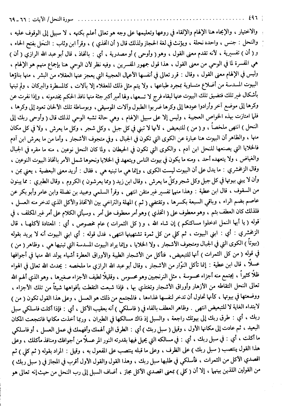 وقال أبو عبد الله الرازي ما ملخصه : يحدث الله تعالى في الهواء ظلاً كثيراً يجتمع منه أجزاء محسوسة مثل النرنجبين وهو محسوس ، وقليلاً لطيف الأجزاء صغيرها ، وهو الذي ألهم الله تعالى النحل التقاطه من الأزهار وأوراق الأشجار ، وتغتذي بها فإذا شبعت التقطت بأفواهها شيئاً من تلك الأجزاء ، ووضعتها في بيوتها كأنها تحاول أن تدخر لنفسها غذاءها ، فالمجتمع من ذلك هو العسل . وعلى هذا القول تكون من لابتداء الغاية ، لا للتبعيض انتهى . وظاهر العطف بالفاء في فاسلكي أنه بعقيب الأكل أي : فإذا أكلت فاسلكي سبل ربك ، أي طرق ربك إلى بيوتك راجعة ، والسبل إذ ذاك مسالكها في الطيران . وربما أخذت مكانها فانتجعت المكان البعيد ، ثم عادت إلى مكانها الأول . وقيل : سبل ربك أي الطرق التي ألهمك وأفهمك في عمل العسل ، أو فاسلكي ما أكلت أي : في سبل ربك ، أي في مسالكه التي يحيل فيها بقدرته النور المر عسلاً من أجوافك ومنافذ مأكلك . وعلى هذا القول ينتصب سبل ربك على الظرف ، وعلى ما قبله ينتصب على المفعول به . وقيل : المراد بقوله ثم كلي ، ثم اقصدي الأكل من الثمرات فاسلكي في طلبها سبل ربك ، وهذا القول والقول الأول أقرب في المجاز في سبل ربك من القولين اللذين بينهما ، إلا أنّ كلي بمعنى اقصدي الأكل ، مجاز أضاف السبل إلى رب النحل من حيث أنه تعالى هو
