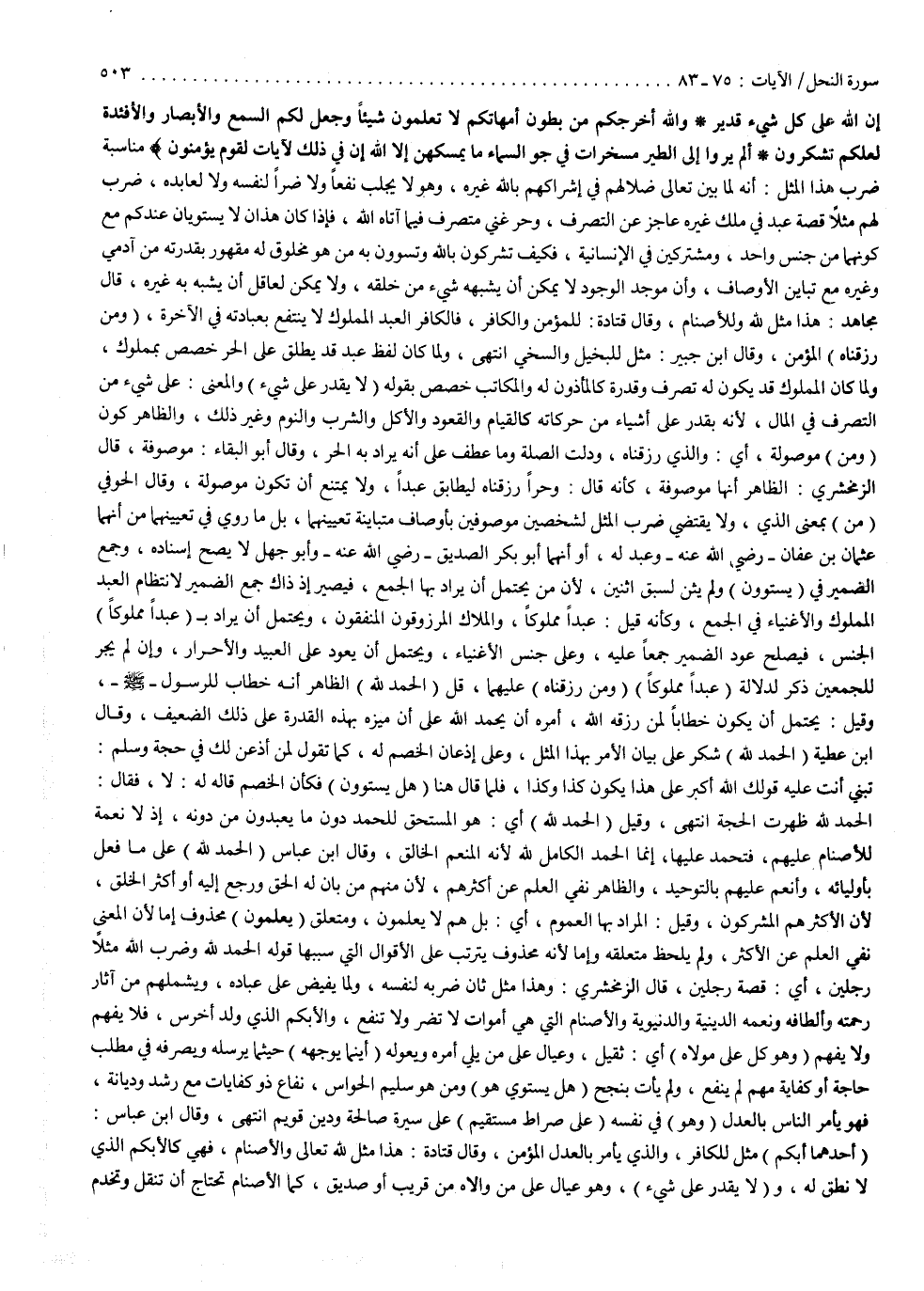 إن الله على كل شيء قدير ، والله أخرجكم من بطون أمهاتكم لا تعلمون شيئا وجعل لكم السمع والأبصار والأفئدة لعلكم تشكرون ، ألم يروا إلى الطير مسخرات في جو السماء ما يمسكهن إلا الله إن في ذلك لآيات لقوم يؤمنون ) } : مناسبة ضرب هذا المثل أنه لما بين تعالى ضلالهم في إشراكهم بالله غيره وهو لا يجلب نفعاً ولا ضراً لنفسه ولا لعابده ، ضرب لهم مثلاً قصة عبد في ملك غيره ، عاجز عن التصرف ، وحر غني متصرف فيما آتاه الله . فإذا كان هذان لا يستويان عندكم مع كونهما من جنس واحد ، ومشتركين في الإنسانية ، فكيف تشركون بالله وتسوون به من مخلوق له مقهور بقدرته من آدمي وغيره ، مع تباين الأوصاف . وأنّ موجد الوجود لا يمكن أن يشبهه شيء من خلقه ، ولا يمكن لعاقل أن يشبه به غيره . قال مجاهد : هذا مثل لله وللأصنام . وقال قتادة : للمؤمن والكافر فالكافر العبد المملوك لا ينتفع بعبادته في الآخرة ، ومن رزقناه المؤمن . وقال ابن جبير : مثل للبخيل والسخي انتهى .