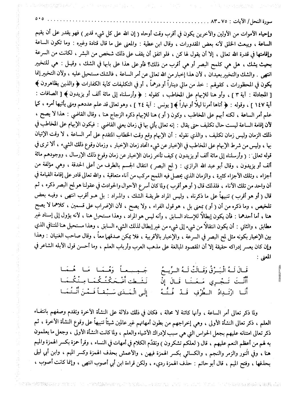 وإحياء الأموات من الأولين والآخرين ، يكون في أقرب وقت أوحاه . أنّ الله على كل شيء قدير ، فهو يقدر على أنْ يقيم الساعة ، ويبعث الخلق ، لأنه بعض المقدورات . وقال ابن عطية : والمعنى على ما قال قتادة وغيره ، وما تكون الساعة وإقامتها في قدرة الله تعالى إلا أن يقول لها : كن فلو اتفق أن يقف على ذلك شخص من البشر لكانت من السرعة بحيث يشك هل هي كلمح البصر ؟ أو هي أقرب من ذلك ؟ فأو على هذا على بابها في الشك . وقيل : هي للتخيير انتهى . والشك والتخيير بعيدان ، لأنّ هذا إخبار من الله تعالى عن أمر الساعة ، فالشك مستحيل عليه . ولأنّ التخيير إنما يكون في المحظورات كقولهم : خذ من مالي ديناراً أو درهماً ، أو في التكليفات كآية الكفارات : ) وَالَّذِينَ يُظَاهِرُونَ ( وأو هنا للإبهام على المخاطب كقوله : ) وَأَرْسَلْنَاهُ إِلَى مِاْئَةِ أَلْفٍ أَوْ يَزِيدُونَ ( وقوله : ) أَتَاهَا أَمْرُنَا لَيْلاً أَوْ نَهَارًا ( وهو تعالى قد علم عددهم ، ومتى يأتيها أمره ، كما علم أمر الساعة ، لكنه أبهم على المخاطب . وكون أو هنا للإبهام ذكره الزجاج هنا . وقال القاض : هذا لا يصح ، لأنّ إقامة الساعة ليست حال تكليف حتى يقال : إنه تعالى يأتي بها في زمان يعني القاضي فيكون الإبهام على المخاطب في ذلك الزمان ، وليس زمان تكليف . والذي نقوله : إن الإبهام وقع وقت الخطاب المتقدم على أمر الساعة ، لا وقت الإتيان بها . وليس من شرط الإبهام على المخاطب في الإخبار عن شيء اتحاد زمان الإخبار وزمان وقوع ذلك الشيء ، ألا ترى في قوله تعالى : ) وَأَرْسَلْنَاهُ إِلَى مِاْئَةِ أَلْفٍ أَوْ يَزِيدُونَ ( كيف تأمر زمان الإخبار عن زمان وقوع ذلك الإرسال ، ووجودهم مائة ألف أو يزيدون . وقال أبو عبد الله الرازي : لمح البصر انتقال الجسم بالطرف من أعلى الحدقة ، وهي مؤلفة من أجزاء وتلك الأجزاء كثيرة ، والزمان الذي يحصل فيه للمح مركب من آناء متعاقبة ، والله تعالى قادر على إقامة القيامة في آن واحد من تلك الآناء ، فلذلك قال : ) أَوْ هُوَ أَقْرَبُ ( ولما كان أسرع الأحوال والحوادث في عقولنا هو لمح البصر ذكره ، ثم قال : أو هو أقرب تنبيهاً على ما ذكرناه ، وليس المراد طريقة الشك ، والمراد بل هو أقرب انتهى . وفيه بعض تلخيص . وما ذكره من أنّ أو بمعنى بل ، هو قول الفراء ، ولا يصح لأنّ الإضراب على قسمين كلاهما لا يصح هنا . أما أحدهما : فإن يكون إبطالاً للإسناد السابق ، وأنه ليس هو المراد ، وها مستحيل هنا ، لأنه يؤول إلى إسناد غير مطابق . والثاني : أن يكون انتقالاً من شيء إلى شيء من غير إبطال لذلك الشيء السابق ، وهذا مستحيل هنا للتنافي الذي بين الإخبار بكونه مثل لمح البصر في السرعة ، والإخبار بالأقربية ، فلا يمكن صدقهما معاً . وقال صاحب الغيان : وهذا وإن كان يعتبر إدراكه حقيقة ، إلا أن المقصود المبالغة على مذهب العرب وأرباب النظم . وما أحسن قول الأبله الشاعر في المعنى : قال له البرق وقالت له الريح