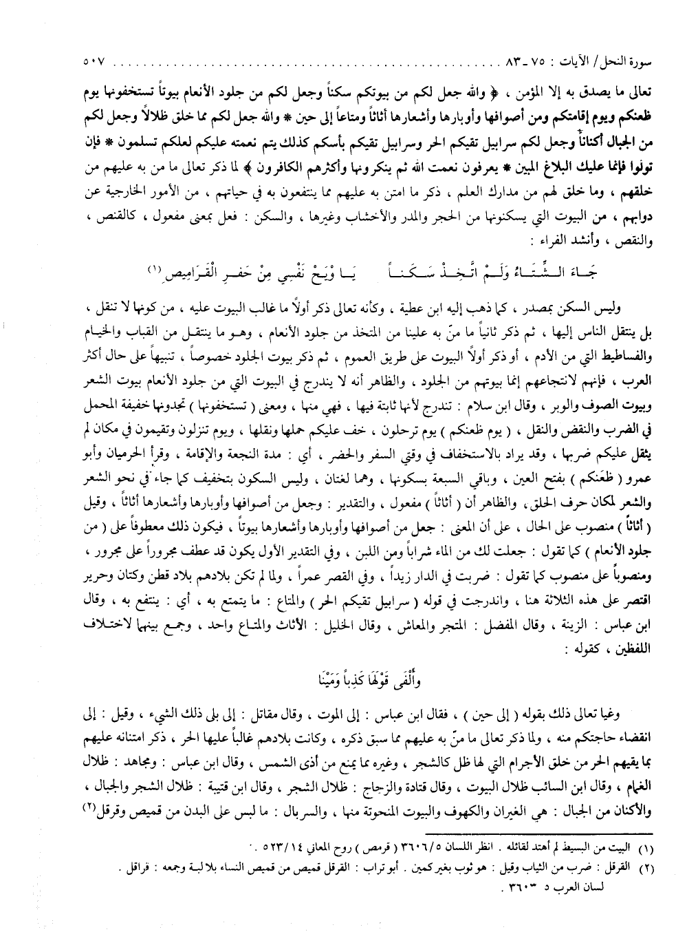 ( وَاللَّهُ جَعَلَ لَكُمْ مّن بُيُوتِكُمْ سَكَنًا وَجَعَلَ لَكُمْ مّن جُلُودِ الاْنْعَامِ بُيُوتًا تَسْتَخِفُّونَهَا يَوْمَ يَوْمَ ظَعْنِكُمْ وَيَوْمَ إِقَامَتِكُمْ وَمِنْ أَصْوَافِهَا وَأَوْبَارِهَا وَأَشْعَارِهَا أَثَاثاً وَمَتَاعاً إِلَى حِينٍ وَاللَّهُ جَعَلَ لَكُمْ مّمَّا خَلَقَ ظِلَالاً وَجَعَلَ لَكُمْ مّنَ الْجِبَالِ أَكْنَاناً وَجَعَلَ لَكُمْ سَرَابِيلَ تَقِيكُمُ الْحَرَّ وَسَرابِيلَ تَقِيكُم بَأْسَكُمْ ( : لما ذكر تعالى ما من به عليهم من خلقهم ، وما خلق لهم من مدارك العلم ، ذكر ما امتن به عليهم مما ينتفعون به في حياتهم من الأمور الخارجية عن دوابهم من البيوت التي يسكنونها ، من الحجر والمدر والأخشاب وغيرها . والسكن فعل بمعنى مفعول ، كالقنص ، والنفص . وأنشد الفراء : جاء الشتاء ولما أتخذ سكنا