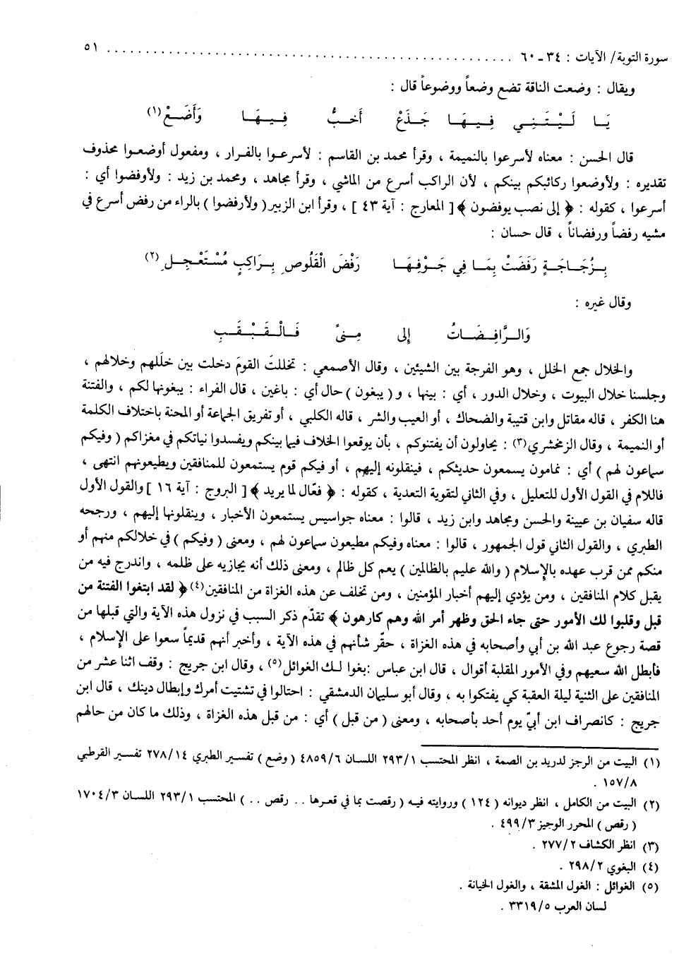 والخلاف جمع الخلل ، وهو الفرجة بين الشيئين . وقال الأصمعي : تخللت القوم دخلت بين خللهم وخلالهم ، وجلسنا خلال البيوت وخلال الدور أي : بينها ، ويبغون حال أي : باغين . قال الفراء : يبغونها لكم . والفتنة هنا الكفر قاله : مقاتل ، وابن قتيبة ، والضحاك . أو العيب والشر قاله : الكلبي . أو تفريق الجماعة أو المحنة باختلاف الكلمة أو النميمة . وقال الزمخشري : يحاولون أن يفتنوكم بأن يوقعوا الخلاف فيما بينكم ، ويفسدوا نياتكم في مغزاكم . وفيكم سماسعون لهم أي : ضامون يسمعون حديثكم فينقلونه إليهم ، أو فيكم قوم يستمعون للمنافقين ويطيعونهم انتهى . فاللام في القول الأول للعليل ، وفي الثاني لتقوية التعدية كقوله : ) فَعَّالٌ لّمَا يُرِيدُ ( والقول الأول قاله : سفيان بن عيينة ، والحسن ، ومجاهد ، وابن زيد ، قالوا : معناه جواسيس يستمعون الأخبار وينقلونها إليهم ، ورجحه الطبري . والقول الثاني قول الجمهور قالوا : معناه وفيكم مطيعون سماعون لهم . ومعنى وفيكم في خلالكم منهم ، أو منكم ممن قرب عهده بالإسلام . والله عليم بالظالمين يعم كل ظالم . ومعنى ذلك : أنه يجازيه على ظلمه . واندرج فيه من يقبل كلام المنافقين ، ومن يؤدي إليهم أخبار المؤمنين ، ومن تخلف عن هذه الغزاة من المنافقين .