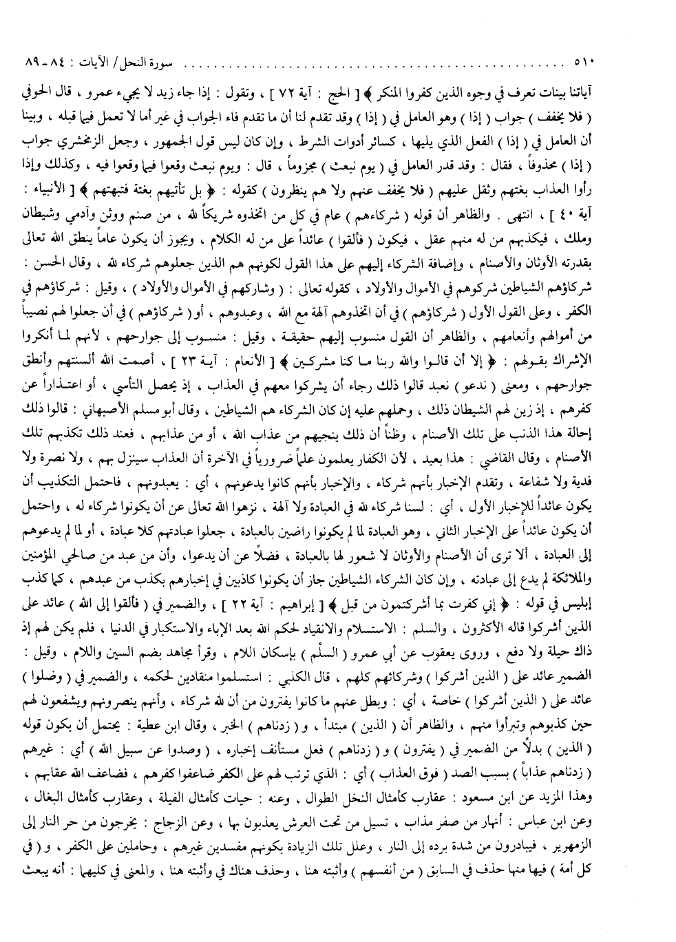 ءايَاتُنَا بَيّنَاتٍ تَعْرِفُ فِى وُجُوهِ الَّذِينَ كَفَرُواْ الْمُنْكَرَ ( وتقول : إذا جاء زيد لا يجيء عمرو . قال الحوفي : فلا يخفف جواب إذا ، وهو العامل في إذا ، وقد تقدم لنا أنّ ما تقدم فاء الجواب في غير أما لا تعمل فيما قبله ، وبينا أنّ العامل في إذا الفعل الذي يليها كسائر أدوات الشرط ، وإن كان ليس قول الجمهور . وجعل الزمخشري جواب إذا محذوفاً فقال : وقد قدر العامل في يوم نبعث مجزوماً قال : ويوم نبعث وقعوا فيما وقعوا فيه ، وكذلك وإذا رأوا العذاب بغتهم وثقل عليهم فلا يخفف ولا هم ينظرون كقوله : ) بَلْ تَأْتِيهِم بَغْتَةً ( فتبهتهم الآية انتهى . والظاهر أن قوله : شركاءهم ، عام في كل من اتخذوه شريكاً لله من صنم ووثن وآدمي وشيطان وملك ، فيكذبهم من له منهم عقل ، فيكون : فألقوا عائداً على من له الكلام ، ويجوز أن يكون عاماً ينطق الله تعالى بقدرته الأوثان والأصنام . وإضافة الشركاء إليهم على هذا القول لكونهم هم الذين جعلوهم شركاء لله . وقال الحسن : شركاؤهم الشياطين ، شركوهم في الأموال والأولاد كقوله تعالى : ) وَشَارِكْهُمْ فِى الاْمْوالِ وَالاْوْلَادِ ( ، وقيل : شركاؤهم في الكفر . وعلى القول الأول شركاؤهم في أنْ اتخذوهم آلهة مع الله وعبدوهم ، أو شركاؤهم في أنْ جعلوا لهم نصيباً من أموالهم وأنعامهم ، والظاهر أنّ القول منسوب إليهم حقيقة . وقيل : منسوب إلى جوارحهم ، لأنهم لما أنكروا الإشراك بقولهم : ) إِلاَّ أَن قَالُواْ وَاللَّهِ رَبّنَا مَا كُنَّا مُشْرِكِينَ ( أصمت الله ألسنتهم وأنطق جوارحهم . ومعنى : تدعو ، ونعبد قالوا ذلك رجاء أن يشركوا معهم في العذاب ، إذ يحصل التأسي ، أو اعتذاراً عن كفرهم إذ زين لهم الشيطان ذلك وحملهم عليه ، إن كان الشركاء هم الشياطين . وقال أبو مسلم الأصبهان . قالوا : ذلك إحالة هذا الذنب على تلك الأصنام ، وظناً أن ذلك ينجيهم من عذاب الله أو من عذابهم ، فعند ذلك تكذيبهم تلك الأصنام . وقال القاضي : هذا بعيد ، لأنّ الكفار يعلمون علماً ضرورياً في الآخرة أن العذاب سينزل بهم ، ولا نصرة ، ولا فدية ، ولا شفاعة . وتقدم الإخبار بأنهم شركاء ، والإخبار أنهم كانوا يدعونهم : أي يعبدونهم ، فاحتمل التذكيب أن يكون عائداً للإخبار الأول أي : لسنا شركاء لله في العبادة ، ولا آلهة نزهوا الله تعالى عن أن يكونوا شركاء له . واحتمل أن يكون عائداً على الإخبار الثاني وهو العبادة ، لما لم يكونوا راضين بالعبادة جعلوا عبادتهم كلا عبادة ، أو لما لم يدعوهم إلى العبادة . ألا ترى أنّ الأصنام والأوثان لا شعور لها بالعبادة ، فضلاً عن أن يدعو وإن من عبد من صالحي المؤمنين والملائكة ، لم يدع إلى عبادته . وإن كان الشركاء الشياطين جاز أن يكونوا كاذبين في إخبارهم بكذب من عبدهم ، كما كذب إبليس في قوله : ) إِنّى كَفَرْتُ بِمَا أَشْرَكْتُمُونِ مِن قَبْلُ ( والضمير في إلى الله فألقوا عائد على الذين أشركوا ، قاله الأكثرون . والسلم : الاستسلام والانقياد لحكم الله بعد الإباء والاستكبار في الدنيا ، فلم يكن لهم إذ ذاك حيلة ولا دفع . وروى يعقوب عن أبي عمرو : السلم بإسكان اللام . وقرأ مجاهد : بضم السين واللام . وقيل : الضمير عائد على الذين أشركوا ، وشركائهم كلهم . قال الكلبي : استسلموا منقادين لحكمه ، والضمير في وضلوا عائد على الذين أشركوا خاصة أي : وبطل عنهم ما كانوا يفترون من أنّ لله شركاء وأنهم ينصرونهم ويشفعون لهم حين كذبوهم وتبرأوا منهم ، والظاهر أنّ الذين مبتدأ وزدناهم الخبر . وقال ابن عطية : يحتمل أن يكون قوله : الذين ، بدلاً من الضمير في يفترون . وزدناهم فعل مستأنف إخباره . وصدوا عن سبيل الله أي : غيرهم زدناهم عذاباً بسبب الصد فوق العذاب ، أي : الذي ترتب لهم على الكفر ضاعفوا كفرهم ، فضاعف الله عقابهم . وهذا المزيد عن ابن مسعود عقارب كأمثال النخل الطوال ، وعنه : حيات كأمثال الفيلة ، وعقارب كأمثال البغال . وعن ابن عباس : أنها من صفر مذاب تسيل من تحت العرش يعذبون بها ، وعن الزجاج : يخرجون من حر النار إلى الزمهرير ، فيبادرون من شدة برده إلى ال