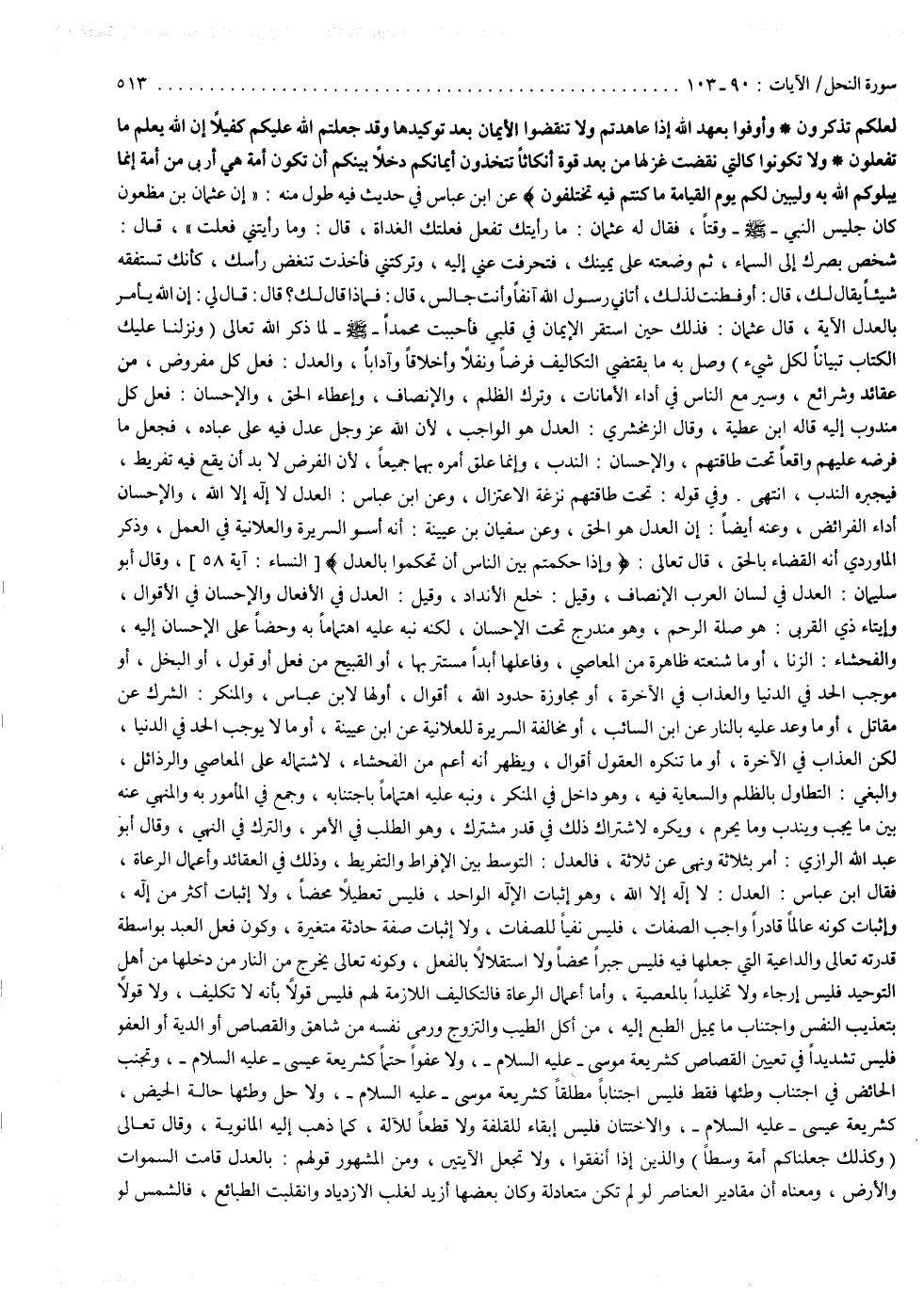 ْ لَعَلَّكُمْ تَذَكَّرُونَ وَأَوْفُواْ بِعَهْدِ اللَّهِ إِذَا عَاهَدتُّمْ وَلاَ تَنقُضُواْ الاٌّ يْمَانَ بَعْدَ تَوْكِيدِهَا وَقَدْ جَعَلْتُمُ اللَّهَ عَلَيْكُمْ كَفِيلاً إِنَّ اللَّهَ يَعْلَمُ مَا تَفْعَلُونَ وَلاَ تَكُونُواْ كَالَّتِى نَقَضَتْ غَزْلَهَا مِن بَعْدِ قُوَّةٍ أَنكَاثًا تَتَّخِذُونَ أَيْمَانَكُمْ دَخَلاً بَيْنَكُمْ أَن تَكُونَ أُمَّةٌ هِىَ أَرْبَى مِنْ أُمَّةٍ إِنَّمَا يَبْلُوكُمُ اللَّهُ بِهِ وَلَيُبَيِّنَنَّ لَكُمْ يَوْمَ الْقِيَامَةِ مَا كُنْتُمْ فِيهِ تَخْتَلِفُونَ إن الله يأمر بالعدل والإحسان وإيتاء ذي القربى وينهى عن الفحشاء والمنكر والبغي يعظكم لعلكم تذكرون وأوفوا بعهد الله إذا عاهدتم ولا تنقضوا الإيمان بعد توكيدها وقد جعلتم الله عليكم كفيلاً إن الله يعلم ما تفعلون ولا تكونوا كالتي نقضت غزلها من بعد قوة أنكاثاً تتخذون أيمانكم دخلاً بينكم أن تكون أمة هي أربى من أمة إنما يبلوكم الله به وليبين لكم يوم القيامة ما كنتم فيه تختلفوه ( : عن ابن عباس في حديث فيه طول منه : إن عثمان بن مظعون كان جليس النبي ( صلى الله عليه وسلم ) ) وقتاً فقال له : عثمان ما رأيتك تفعل فعلتك الغداة ؟ قال : ( وما رأيتني فعلت ؟ ) قال : شخص بصرك إلى السماء ثم وضعته على يمينك فتحرفت عني إليه وتركتني ، فأخذت تنغض رأسك كأنك تستفقه شيئاً يقال لك قال : ( أو فطنت لذلك ؟ أتاني رسول الله آنفاً وأنت جالس ) قال : فماذا قال لك : قال لي : ) ( : عن ابن عباس في حديث فيه طول منه : إن عثمان بن مظعون كان جليس النبي ( صلى الله عليه وسلم ) ) وقتاً فقال له : عثمان ما رأيتك تفعل فعلتك الغداة ؟ قال : ( وما رأيتني فعلت ؟ ) قال : شخص بصرك إلى السماء ثم وضعته على يمينك فتحرفت عني إليه وتركتني ، فأخذت تنغض رأسك كأنك تستفقه شيئاً يقال لك قال : ( أو فطنت لذلك ؟ أتاني رسول الله آنفاً وأنت جالس ) قال : فماذا قال لك : قال لي : ) إِنَّ اللَّهَ يَأْمُرُ بِالْعَدْلِ ( الآية . قال عثمان : فذلك حين استقر الإيمان في قلبي ، فأحببت محمداً ( صلى الله عليه وسلم ) ) لما ذكر الله تعالى . ونزلنا عليك الكتاب تبياناً لكل شيء ، وصل به ما يقتضي التكاليف فرضاً ونفلاً وأخلاقاً وآداباً . والعدل فعل كل مفروض من عقائد ، وشرائع ، وسير مع الناس في أداء الأمانات ، وترك الظلم والإنصاف ، وإعطاء الحق والإحسان فعل كل مندوب إليه قاله ابن عطية . وقال الزمخشري : العدل هو الواجب ، لأن الله عز وجل عدل فيه على عباده ، فجعل ما فرضه عليهم واقعاً تحت طاقتهم . والإحسان الندب ، وإنما علق أمره بهم جميعاً ، لأنّ الفرض لا بد أن يقع فيه تفريط فيجبره الندب انتهى . وفي قوله : تحت طاقتهم ، نزغة الاعتزال . وعن ابن عباس : العدل لا إله إلا الله ، والإحسان أداء الفرائض . وعنه أيضاً أنّ العدل هو الحق . وعن سفيان بن عيينة : أنه أسوأ السريرة والعلانية في العمل . وذكر الماوردي أنه القضاء بالحق قال تعالى : ) وَإِذَا حَكَمْتُمْ بَيْنَ النَّاسِ أَن تَحْكُمُواْ بِالْعَدْلِ ( وقال أبو سليمان : العدل في لسان العرب الانصاف . وقيل : خلع الأنداد . وقيل : العدل في الأفعال والإحسان في الأقوال . وإيتاء ذي القربى : هو صلة الرحم ، وهو مندرج تحت الإحسان ، لكنه نبه عليه اهتمامه به وحضاً على الإحسان إليه . والفحشاء : الزنا ، أو ما شنعته ظاهرة من المعاصي . وفاعلها أبداً مستتر بها ، أو القبيح من فعل أو قول ، أو البخل ، أو موجب الحد في الدنيا والعذاب في الآخرة ، أو مجاوزة حدود الله أقوال ، أولها لابن عباس . والمنكر : الشرك عن مقاتل ، أو ما وعد عليه بالنار عن ابن السائب ، أو مخالفة السريرة للعلانية عن ابن عيينة ، أو ما لا يوجب الحد في الدنيا لكن العذاب في الآخرة . أو ما تنكره العقول أقوال ، ويظهر أنه أعم من الفحشاء لاشتماله على المعاصي والرذائل والبغي : التطاول بالظلم والسعاية فيه ، وهو داخل في المنكر ، ونبه عليه اهتماماً باجتنابه . وجمع في المأمور به والمنهى عنه بين ما يجب ويندب ، وما يحرم ويكره ، لاشتراك ذلك في قدر مشترك وهو 