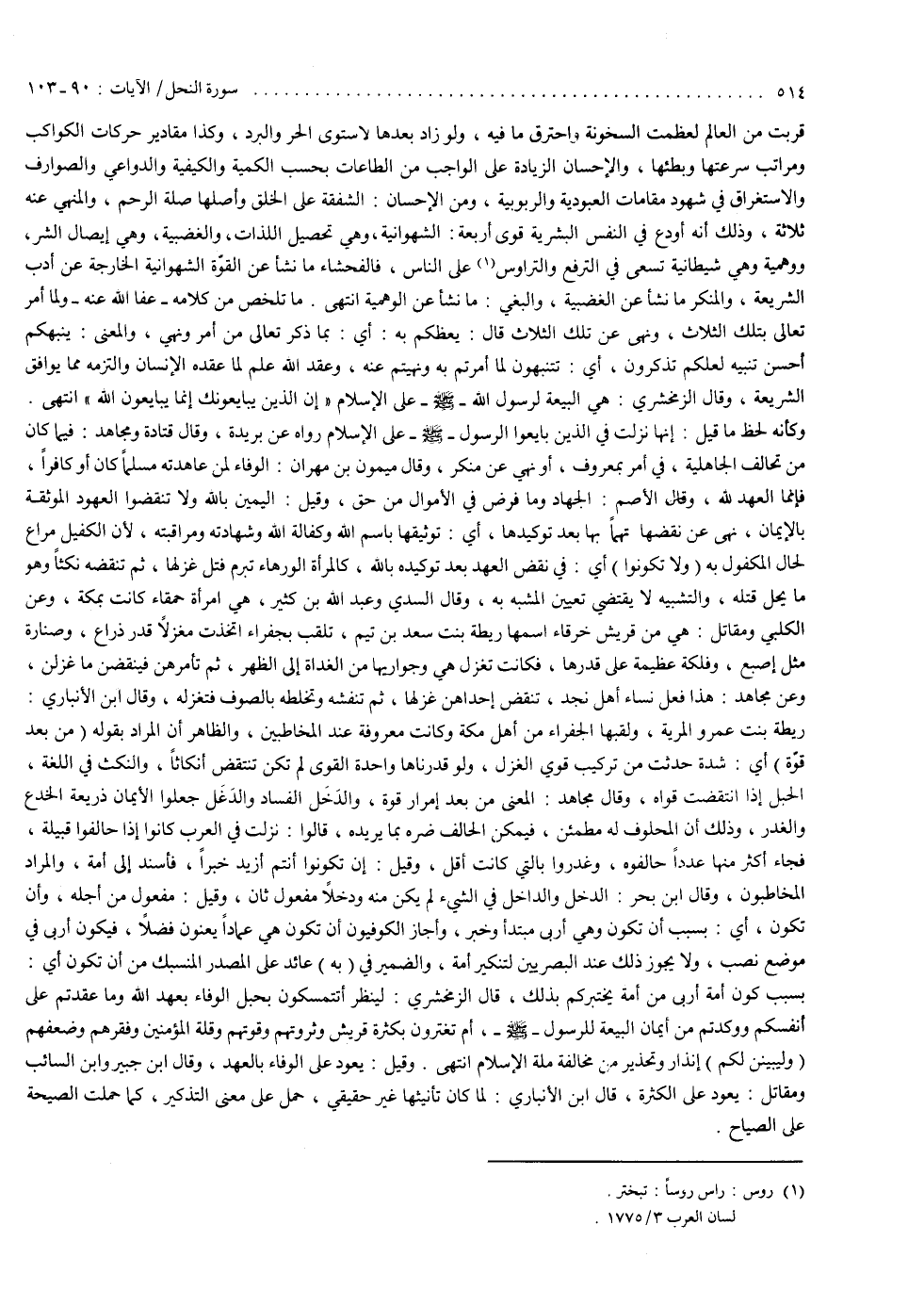 قربت من العالم لعظمت السخونة واحترق ما فيه ، ولو زاد بعدها لاستوى الحر والبرد . وكذا مقادير حركات الكواكب ، ومراتب سرعتها ، وبطئها . والإحسان : الزيادة على الواجب من الطاعات بحسب الكمية والكيفية ، والدواعي ، والصوارف ، والاستغراق في شهود مقامات العبودية والربوبية . ومن الإحسان الشفقة على الخلق ، وأصلها صلة الرحم ، والمنهى عنه ثلاثة . وذلك أنه أودع في النفس البشرية قوى أربعة : الشهوانية وهي تحصيل اللذات ، والغضبية وهي : إيصال الشر ، ووهمية : وهي شيطانية تسعى في الترفع والتراوس على الناس . فالفحشاء ما نشأ عن القوّة الشهوانية الخارجة عن أدب الشريعة ، والمنكر ما نشأ عن الغضبية ، والبغي ما نشأ عن الوهمية انتهى . ما تخلص من كلامه عفا الله عنه . ولما أمر تعالى بتلك الثلاث ، ونهى عن تلك الثلاث قال : يعظكم به ، أي بما ذكر تعالى من أمر ونهي ، والمعنى : ينبهكم أحسن تنبيه لعلكم تذكرون أي : تتنبهون لما أمرتم به ونهيتم عنه ، وعقد الله علم لما عقده الإنسان والتزمه مما يوافق الشريعة . وقال الزمخشري : هي البيعة لرسول الله ( صلى الله عليه وسلم ) ) ) إِنَّ الَّذِينَ يُبَايِعُونَكَ إِنَّمَا يُبَايِعُونَ اللَّهَ ). وكأنه لحظ ما قيل أنها نزلت في الذين بايعوا الرسول ( صلى الله عليه وسلم ) ) على الإسلام ، رواه عن بريدة . وقال قتادة ومجاهد : فيما كان من تحالف الجاهلية في أمر بمعروف أو نهي عن منكر . وقال ميمون بن مهران : الوفاء لمن عاهدته مسلماً كان أو كافراً ، فإنما العهد لله . وقال الأصم : الجهاد وما فرض في الأموال من حق . وقيل : اليمين بالله ، ولا تنقضوا العهود الموثقة بالإيمان ، نهى عن نقضها تهمماً بها بعد توكيدها أي : توثيقها باسم الله وكفالة الله وشهادته ، ومراقبته ، لأن الكفيل مراع لحال المكفول به . ولا تكونوا أي : في نقض العهد بعد توكيده بالله كالمرأة الورهاء تبرم فتل غزلها ثم تنقضه نكثاً ، وهو ما يحل فتله . والتشبيه لا يقتضي تعيين المشبه به . وقال السدي ، وعبد الله بن كثير : هي امرأة حمقاء كانت بمكة . وعن الكلبي ومقاتل : هي من قريش خرقاء اسمها ريطة بنت سعد بن تيم ، تلقب بجفراء ، اتخذت مغزلاً قدر ذراع ، وصنارة مثل أصبع ، وفلكة عظيمة على قدرها ، فكانت تغزل هي وجواريها من الغداة إلى الظهر ، ثم تأمرهن فينقضن ما غزلن . وعن مجاهد : هذا فعل نساء أهل نجد ، تنقض إحداهن غزلها ثم تنفشه ، وتخلطه بالصوف فتغزله . وقال ابن الأنباري : ريطة بنت عمرو المرية ، ولقبها الجفراء من أهل مكة ، وكانت معروفة عند المخاطبين . والظاهر أنّ المراد بقوله : من بعد قوّة أي : شدة حدثت من تركيب قوى الغزل . ولو قدرناها واحدة القوى لم تكن تنتقض أنكاثاً . والنكث في اللغة الحبل إذا انتقضت قواه . وقال مجاهد : المعنى من بعد إمرار قوة . والدخل : الفساد والدغل ، جعلوا الإيمان ذريعة إلى الخدع والغدر ، وذلك أن المحلوف له مطمئن ، فيمكن الحالف ضره بما يريده . قالوا : نزلت في العرب كانوا إذا حالفوا قبيلة فجاء أكثر منها عدداً حالفوه وغدروا بالتي كانت أقل . وقيل : أن تكونوا أنتم أزيد خبراً ، فأسند إلى أمة ، والمراد المخاطبون . وقال ابن بحر : الدخل والداخل في الشيء لم تكن منه ، ودخلاً مفعول ثان . وقيل : مفعول من أجله ، وأن تكون أي : بسبب أن تكون وهي أربى مبتدأ وخبر . وأجاز الكوفيون أن تكون هي عماداً يعنون فضلاً ، فيكون أربى في موضع نصب ، ولا يجوز ذلك عند البصريين لتنكير أمة . والضمير في به عائد على المصدر المنسبك من أن تكون أي : بسبب كون أمة أربى من أمة يختبركم بذلك . قال الزمخشري : لينظر أتتمسكون بحبل الوفاء بعهد الله ، وما عقدتم على أنفسكم ووكدتم من أيمان البيعة للرسول ( صلى الله عليه وسلم ) ) ، أم تغترون بكثرة قريش وثروتهم وقوتهم وقلة المؤمنين وفقرهم وضعفهم وليبينن لكم : إنذار وتحذير من مخالفة ملة الإسلام انتهى . وقيل : يعود على الوفاء بالعهد . وقال ابن جبير ، وابن السائب ، ومقاتل : يعود على الكثرة . قال ابن الأنباري : لما كان تأنيثها غير حقيقي حمل على معنى التذكير ، كما حملت الصيحة على الصيا