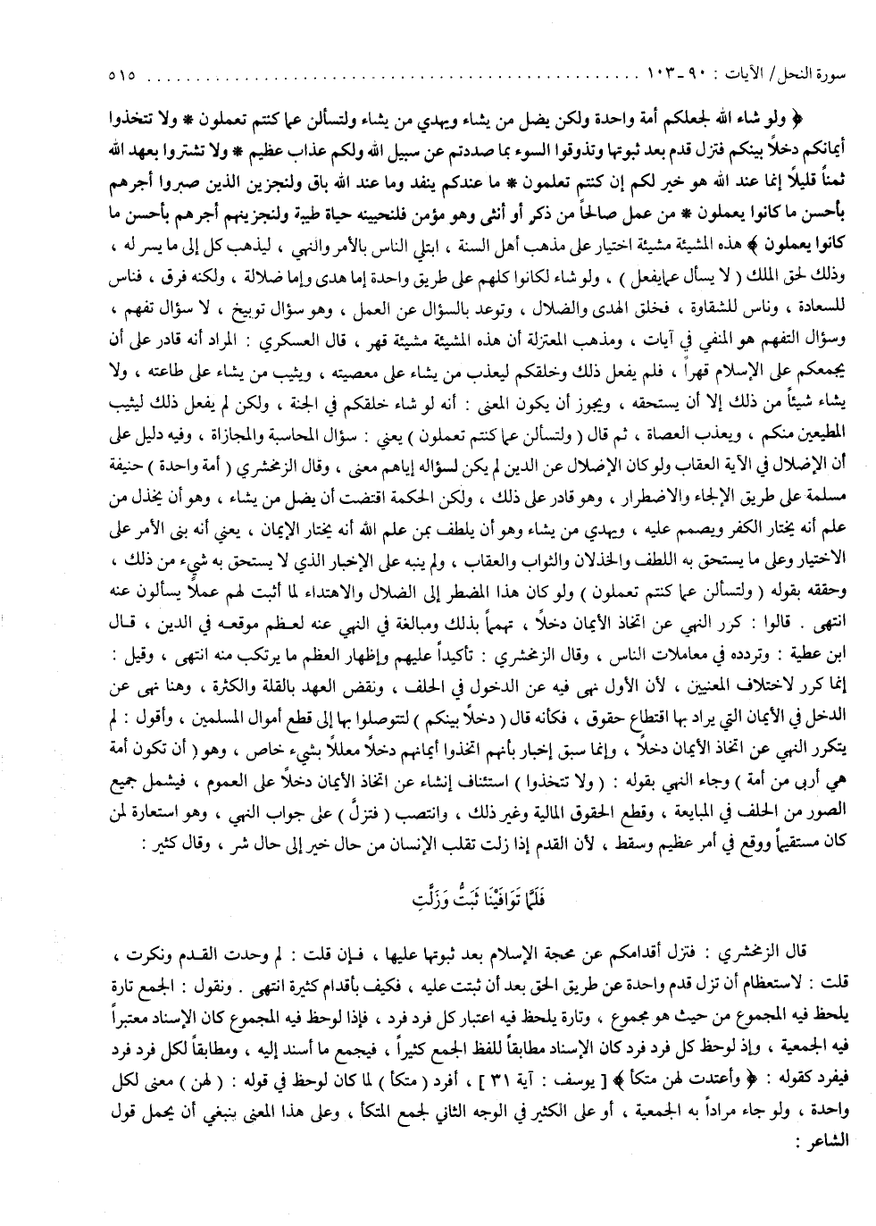 ) وَلَوْ شَآء اللَّهُ لَجَعَلَكُمْ أُمَّةً واحِدَةً وَلاكِن يُضِلُّ مَن يَشَآء وَيَهْدِى مَن يَشَآء وَلَتُسْئَلُنَّ عَمَّا كُنتُمْ تَعْمَلُونَ تَعْمَلُونَ وَلاَ تَتَّخِذُواْ أَيْمَانَكُمْ دَخَلاً بَيْنَكُمْ فَتَزِلَّ قَدَمٌ بَعْدَ ثُبُوتِهَا وَتَذُوقُواْ الْسُّوء بِمَا صَدَدتُّمْ عَن سَبِيلِ اللَّهِ وَلَكُمْ عَذَابٌ عَظِيمٌ ( : هذه المشيئة مشيئة اختيار على مذهب أهل السنة ، ابتلى الناس بالأمر والنهي ليذهب كل إلى ما يسر له ، وذلك لحق الملك لا يسأل عما يفعل . ولو شاء لكانوا كلهم على طريق واحدة ، إما هدى ، وإما ضلالة ، ولكنه فرق ، فناس للسعادة ، وناس للشقاوة . فخلق الهدى والضلال ، وتوعد بالسؤال عن العمل ، وهو سؤال توبيخ لا سؤال تفهم ، وسؤال التفهم هو المنفى في آيات . ومذهب المعتزلة أن هذه المشيئة مشيئة قهر . قال العسكري : المراد أنه قادر على أن يجمعكم على الإسلام قهراً ، فلم يفعل ذلك ، وخلقكم ليعذب من يشاء على معصيته ، ويثيب من يشاء على طاعته ، ولا يشاء شيئاً من ذلك إلا أن يستحقه . ويجوز أن يكون المعنى : أنه لو شاء خلقكم في الجنة ، ولكن لم يفعل ذلك ليثيب المطيعين منكم ، ويعذب العصاة .