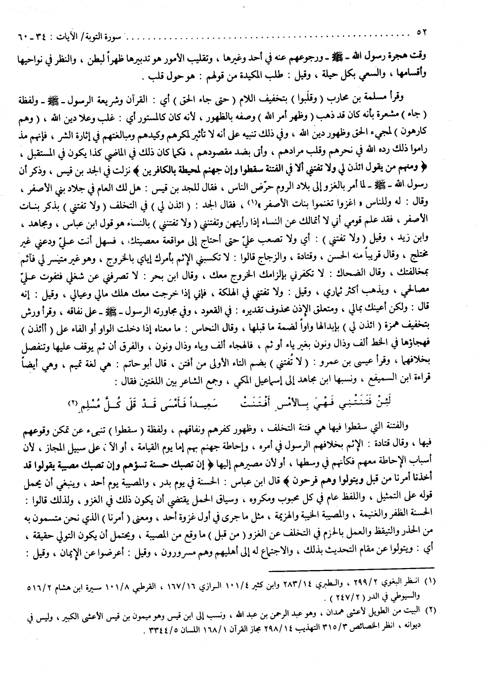 ( وَمِنْهُمْ مَّن يَقُولُ ائْذَن لّي وَلاَ تَفْتِنّى أَلا فِى الْفِتْنَةِ سَقَطُواْ وَإِنَّ جَهَنَّمَ لَمُحِيطَةٌ بِالْكَافِرِينَ ( : نزلت في الجد بن قيس ، وذكر أن رسول الله ( صلى الله عليه وسلم ) ) لما أمر بالغزو إلى بلاد الروم حرض الناس فقال للجد بن قيس : ( هل لك العام في جلاد بني الأصفر ) وقال له وللناس : ( اغزوا تغنموا بنات الأصفر ) . فقال الجد : ائذن لي في التخلف ولا تفتني بذكربنات الأصفر ، فقد علم قومي أني لا أتمالك عن النساء إذا رأيتهم وتفتنني ، ولا تفتني بالنساء . هو قول ابن عباس ومجاهد وابن زيد . وقيل : ولا تفتني أي ولا تصعب عليّ حتى احتاج إلى مواقعة معصيتك فسهِّل عليّ ، ودعني غير مختلج . وقال قريباً منه الحسن وقتادة والزجاج قالوا : لا تكسبني الإثم بأمرك إياي بالخروج وهو غير متيسر لي ، فآثم بمخالفتك . وقال الضحاك : لا تكفرني بإلزامك الخروج معك . وقال ابن بحر : لا تصرفني عن شغلي معك هلك مالي وعيالي . وقيل : إنه قال : ولكنْ أعينك بمالي . ومتعلق الإذن محذوف تقديره : في القعود وفي مجاورته الرسول ( صلى الله عليه وسلم ) ) على نفاقه . وقرأ ورش : بتخفيف همزة إئذن لي بإبدالها واواً لضمة ما قبلها . وقال النحاس ما معناه : إذا دخلت الواو أو الفاء على أأئذن ، فهجاؤها في الخط ألف وذال ونون بغير ياء ، أو ثم فالهجاء ألف وياء وذال ونون ، والفرق أنَّ ثم يوقف عليها وتنفصل بخلافهما . وقرأ عيسى بن عمرو : لا تفتني بضم التاء الأولى من أفتن . قال أبو حاتم هي لغة تميم ، وهي أيضاً قراءة ابن السميقع ، ونسبها ابن مجاهد إلى إسماعيل المكي . وجمع الشاعر بين اللغتين فقال : لئن فتنتني فهي بالأمس أفتنت
