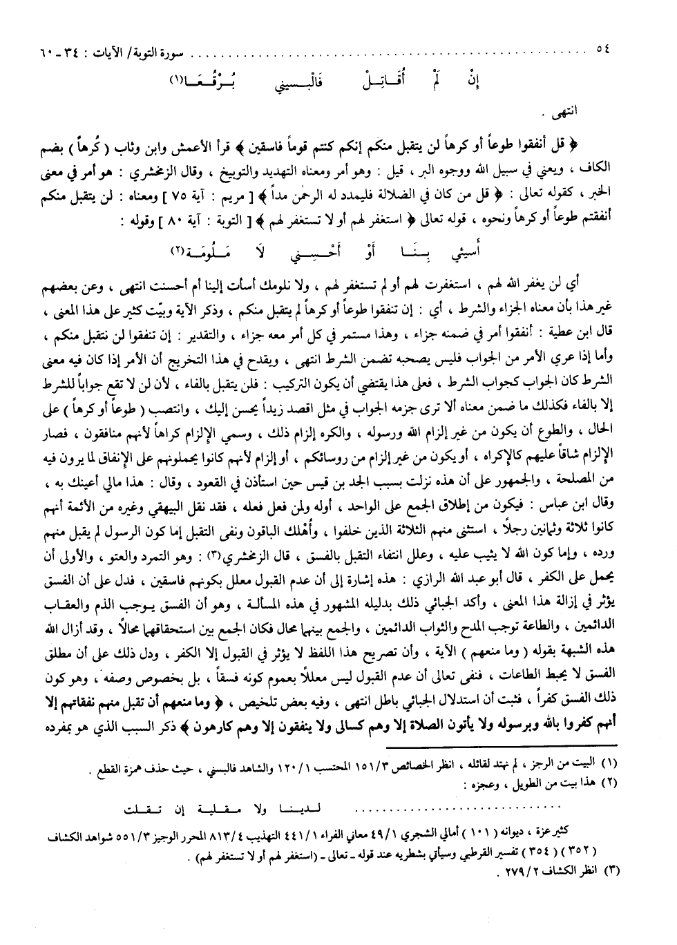 والجمهور على أنّ هذه نزلت بسبب الجد بن قيس حين استأذن في القعود وقال : هذا مالي أعينك به . وقال ابن عباس : فيكون من إطلاق الجمع على الواحد أوله ولمن فعل فعله . فقد نقل البيهقي وغيره من الأئمة أنهم كانوا ثلاثة وثمانين رجلاً ، استثنى منهم الثلاثة الذين خلفوا وأهلك الباقون ، ونفى التقبل إما كون الرسول لم يقبله منهم ورده ، وإما كون الله لا يثيب عليه ، وعلل انتفاء التقبل بالفسق . قال الزمخشري : وهو التمرد والعتو ، والأولى أن يحمل على الكفر . قال أبو عبد الله الرازي : هذه إشارة إلى أنّ عدم القبول معلل بكونهم فاسقين ، فدلَّ على أن الفسق يؤثر في إزالة هذا المعنى . وأكد الجبائي ذلك بدليله المشهور في هذه المسألة ، وهو أن الفسق يوجب الذم والعقاب الدائمين ، والطاعة توجب المدح والثواب الدائمين ، والجمع بينهما محال . فكان الجمعُ بين استحقاقهما محالاً ، وقد أزال الله هذه الشبهة بقوله : ) وَمَا مَنَعَهُمْ ( الآية وأن تصريح هذا اللفظ لا يؤثر في القول إلا الكفر . ودل ذلك على أن مطلق الفسق لا يحبط الطاعات ، فنفى تعالى أنّ عدم القبول ليس معللاً بعموم كونه فسقاً ، بل بخصوص وصفه وهو كون ذلك الفسق كفراً ، فثبت أنّ استدلال الجبائي باطل انتهى . وفيه بعض تلخيص .