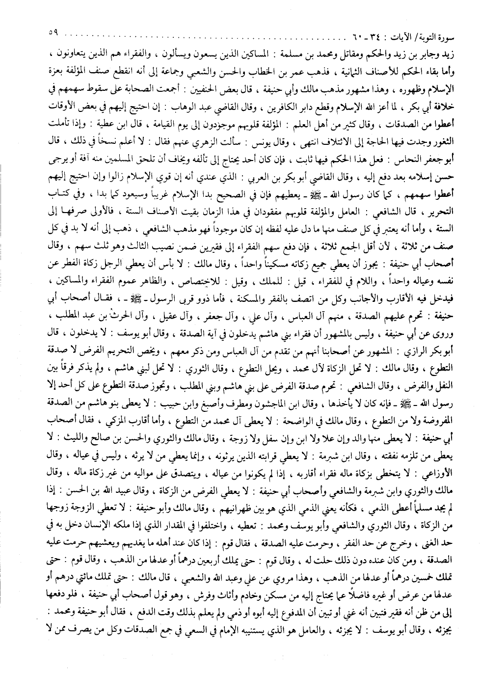 وأما بقاء الحكم للأصناف الثمانية فذهب عمر بن الخطاب والحسن والشعبي وجماعة : إلى أنه انقطع صنف المؤلفة بعزة الإسلام وظهوره ، وهذا مشهور مذهب مالك وأبي حنيفة ، قال بعض الحنفيين : أجمعت الصحابة على سقوط سهمهم في خلافة أبي بكر لما أعز الله الإسلام وقطع دابر الكافرين . وقال القاضي عبد الوهاب : إن احتيج إليهم في بعض الأوقات أعطوا من الصدقات . وقال كثير من أهل العلم : المؤلفة قلوبهم موجودون إلى يوم القيامة . قال ابن عطية : وإذا تأملت الثغور وجدت فيها الحاجة إلى الائتلاف انتهى . وقال يونس : سألت الزهري عنهم فقال : لا أعلم نسخاً في ذلك . قال أبو جعفر النحاس : فعل هذا الحكم فيهم ثابت ، فإن كان أحد يحتاج إلى تألفه ويخاف أن تلحق المسلمين منه آفة أو يرجى حسن إسلامه بعدُ دفع إليه . وقال القاضي أبو بكر بن العربي : الذي عندي أنه إن قوي الإسلام زالوا ، وإن احتيج إليهم أعطوا سهمهم ، كما كان رسول الله ( صلى الله عليه وسلم ) ) يعطيهم . فإن في الصحيح : ( بدا الإسلام غريباً وسيعود كما بدا ) وفي كتاب التحرير قال الشافعي : العامل والمؤلفة قلوبهم مفقودان في هذا الزمان ، بقيت الأصناف الستة ، فالأولى صرفها إلى الستة . وأما أنه يعتبر في كل صنف منها ما دل عليه لفظه إن كان موجوداً فهو مذهب الشافعي ، ذهب إلى أنه لا بد في كل صنف من ثلاثة ، لأن أقلّ الجمع ثلاثة ، فإن دفع سهم الفقراء إلى فقيرين ضمن نصيب الثالث وهو ثلث سهم . وقال أصحاب أبي حنيفة : يجوز أن يعطي جميع زكاته مسكيناً واحداً . وقال مالك : لا بأس أن يعطي الرجل زكاة الفطر عن نفسه وعياله واحداً ، واللام في للفقراء . قيل : للملك . وقيل : للاختصاص .