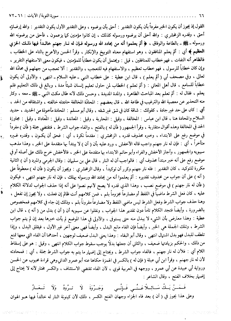 ( أَلَمْ يَعْلَمُواْ أَنَّهُ مَن يُحَادِدِ اللَّهَ وَرَسُولَهُ فَأَنَّ لَهُ نَارَ جَهَنَّمَ خَالِداً فِيهَا ذالِكَ الْخِزْىُ الْعَظِيمُ ( أي ألم يعلم المنافقون ؟ وهو استفهام معناه التوبيخ والإنكار . وقرأ الحسن والأعرج : بالتاء على الخطاب ، فالظاهر أنه التفات ، فهو خطاب للمنافقين . قيل : ويحتمل أن يكون خطاباً للمؤمنين ، فيكون معنى الاستفهام التقرير . وإن كان خطاباً للرسول فهو خطاب تعظيم ، والاستفهام فيه للتعجب ، والتقدير : ألا تعجب من جهلهم في محادّة الله تعالى : وفي مصحف أبيّ ألم يعلم . قال ابن عطية : على خطاب النبي عليه السلام انتهى . والأولى أن يكون خطاباً للسامع ، قال أهل المعاني : ألم تعلم ، الخطاب لمن حاول تعليم إنسان شيئاً مدة وبالغ في ذلك التعليم فلم يعلم فقال له : ألم تعلم بعد المباحث الظاهرة والمدة المديدة ، وحسن ذلك لأنه طال مكث النبي ( صلى الله عليه وسلم ) ) معه ، وكثر منه التحذير عن معصية الله والترغيب في طاعة الله . قال بعضهم : المحادّة المخالفة ، حاددته خالفته ، واشتقاقه من الحد أي كان على حد غير حادة كقولك : شاقة ، كان في شق غير شقه . وقال أبو مسلم : المحادة مأخوذة من الحديد ، حديد السلاح . والمحادة هنا ، قال ابن عباس : المخالفة . وقيل : المحاربة . وقيل : المعاندة . وقيل : المعادة . وقيل : مجاوزة الحد في المخالفة . وهذه أقوال متقاربة . وقرأ الجمهور فإنّ له بالفتح ، والفاء جواب الشرط . فتقتضي جملة وإنّ له مفرد في موضع رفع على الابتداء ، وخبره محذوف قدره الزمخشري : مقدماً نكرة أي : فحق أن يكون وقدره غيره : متأخراً أي فإن له نار جهنم واجب ، قاله : الأخفش ، ورد عليه بأن أنْ لا يبتدأ بها متقدمة على الخبر ، وهذا مذهب سيبويه والجمهور . وأجاز الأخفش والفراء وأبو حاتم الابتداء بها متقدمة على الخبر ، فالأخفش خرج ذلك على أصله . أو في موضع رفع على أنه خبر مبتدأ محذوف ، أي : فالواجب أنّ له النار . قال علي بن سليمان : وقال الجرمي والمبرد : إن الثانية مكررة للتوكيد ، كان التقدير : فله نار جهنم ، وكرر أنّ توكيداً . وقال الزمخشري : ويجوز أن يكون فإن له معطوفاً على أنه ، على أن جواب من محذوف تقديره : ألم يعلموا أنه من يحادد الله ورسوله يهلك فإن له نار جهنم انتهى ، فيكون فإنّ له نار جهنم في موضع نصب . وهذا الذي قدره لا يصح ، لأنهم نصوا على أنه إذا حذف الجواب لدلالة الكلام عليه كان فعل الشرط ماضياً في اللفظ ، أو مضارعاً مجزوماً بلم ، فمن كلامهم : أنت ظالم إن فعلت ، ولا يجوز أن تفعل ، وهنا حذف جواب الشرط ، وفعل الشرط ليس ماضي اللفظ ولا مضارعاً مقروناً بلم ، وذلك إنْ جاء في كلامهم فمخصوص بالضرورة . وأيضاً فتجد الكلام تاماً دون تقدير هذا الجواب . ونقلوا عن سيبويه أنّ أنّ بدل من أنه . قال ابن عطية : وهذا معترض بأن الشيء لا يبدل منه حتى يستوفى . والأولى في هذا الموضع لم يأت خبرها بعد أن لم يتم جواب الشرط ، وتلك الجملة هي الخبر . وأيضاً فإنّ الفاء مانع البدل وأيضاً ، فهي معنى آخر غير الأول ، فيقلق البدل . وإذا تلطف للبدل فهو بدل اشتمال انتهى . وقال أبو البقاء : وهذا يعني البدل ضعيف لوجهين : أحدهما : أن الفاء التي معها تمنع من ذلك ، والحكم بزيادتها ضعيف . والثاني : أن جعلها بدلاً يوجب سقوط جواب الكلام انتهى . وقيل : هو على إسقاط اللام أي : فلأن له نار جهنم ، فالفاء جواب الشرط ، ويحتاج إلى إضمار ما يتم به جواب الشرط جملة أي : فمحادته لأن له نار جهنم . وقرأ ابن أبي عبلة : فإن له بالكسر في الهمزة حكاها عنه أبو عمرو الداني ، وهي قراءة محبوب عن الحسن ، ورواية أبي عبيدة عن أبي عمرو ، ووجهه في العربية قوي لأنّ الفاء تقتضي الاستئناف ، والكسر مختار لأنه لا يحتاج إلى إضمار ، بخلاف الفتح . وقال الشاعر : فمن يك سائلاً عني فإني