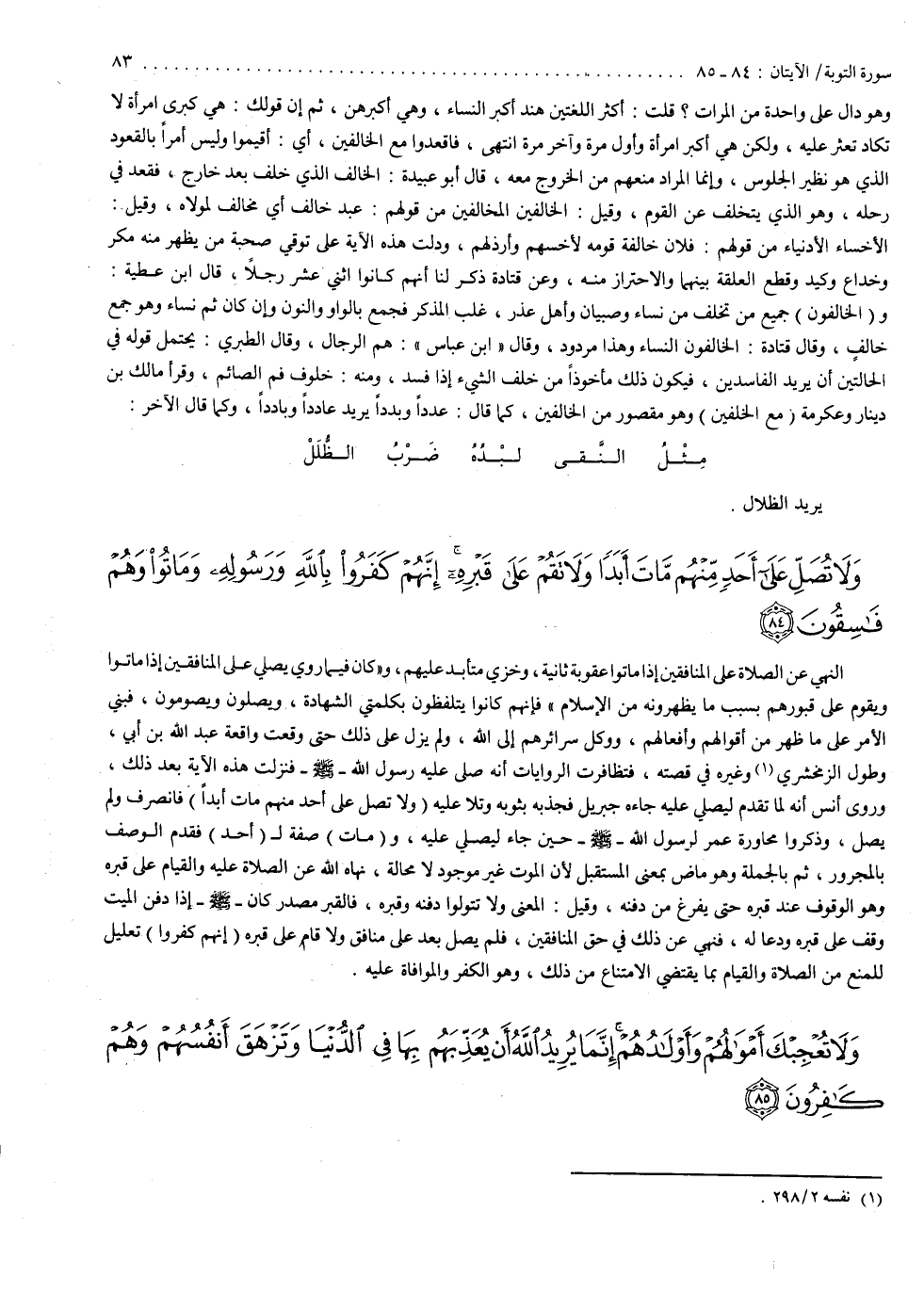 ( وَلاَ تُصَلّ عَلَى أَحَدٍ مّنْهُم مَّاتَ أَبَداً وَلاَ تَقُمْ عَلَى قَبْرِهِ إِنَّهُمْ كَفَرُواْ بِاللَّهِ وَرَسُولِهِ وَمَاتُواْ وَهُمْ فَاسِقُونَ ( : النهي عن الصلاة على المنافقين إذا ماتوا عقوبة ثانية وخزي متأبد عليهم . وكان فيما روي يصلي على المنافقين إذا ماتوا ، ويقوم على قبورهم بسبب ما يظهرونه من الإسلام ، فإنهم كانوا يتلفظون بكلمتي الشهادة ، ويصلون ، ويصومون ، فبنى الأمر على ما ظهر من أقوالهم وأفعالهم ، ووكل سرائرهم إلى الله ، ولم يزل على ذلك حتى وقعت واقعة عبد الله بن أبي . وطول الزمخشري وغيره في قصته ، فتظافرت الروايات أنه صلى عليه رسول الله ( صلى الله عليه وسلم ) ) فنزلت هذه الآية بعد ذلك . وروى أنس أنه لما تقدم ليصلي عليه جاءه جبريل فجذبه بثوبه وتلا عليه : ولا تصل على أحد منهم مات أبداً ، فانصرف ولم يصل . وذكروا محاورة عمر لرسول الله ( صلى الله عليه وسلم ) ) حين جاء ليصلي عليه . ومات صفة لا حد ، فقدم الوصف بالمجرور ثم بالجملة ، وهو ماض بمعنى المستقبل ، لأن الموت غير موجود لا محالة . نهاه الله عن الصلاة عليه ، والقيام على قبره وهو الوقوف عند قبره حتى يفرغ من دفنه . وقيل : المعنى ولا تتولوا دفنه وقبره ، فالقبر مصدره . كان ( صلى الله عليه وسلم ) ) إذا دفن الميت وقف على قبره ودعا له ، فنهي عن ذلك في حق المنافقين ، فلم يصل بعد على منافق ، ولا قام على قبره . إنهم كفروا تعليل للمنع من الصلاة والقيام بما يقتضي الامتناع من ذلك ، وهو الكفر والموافاة عليه .