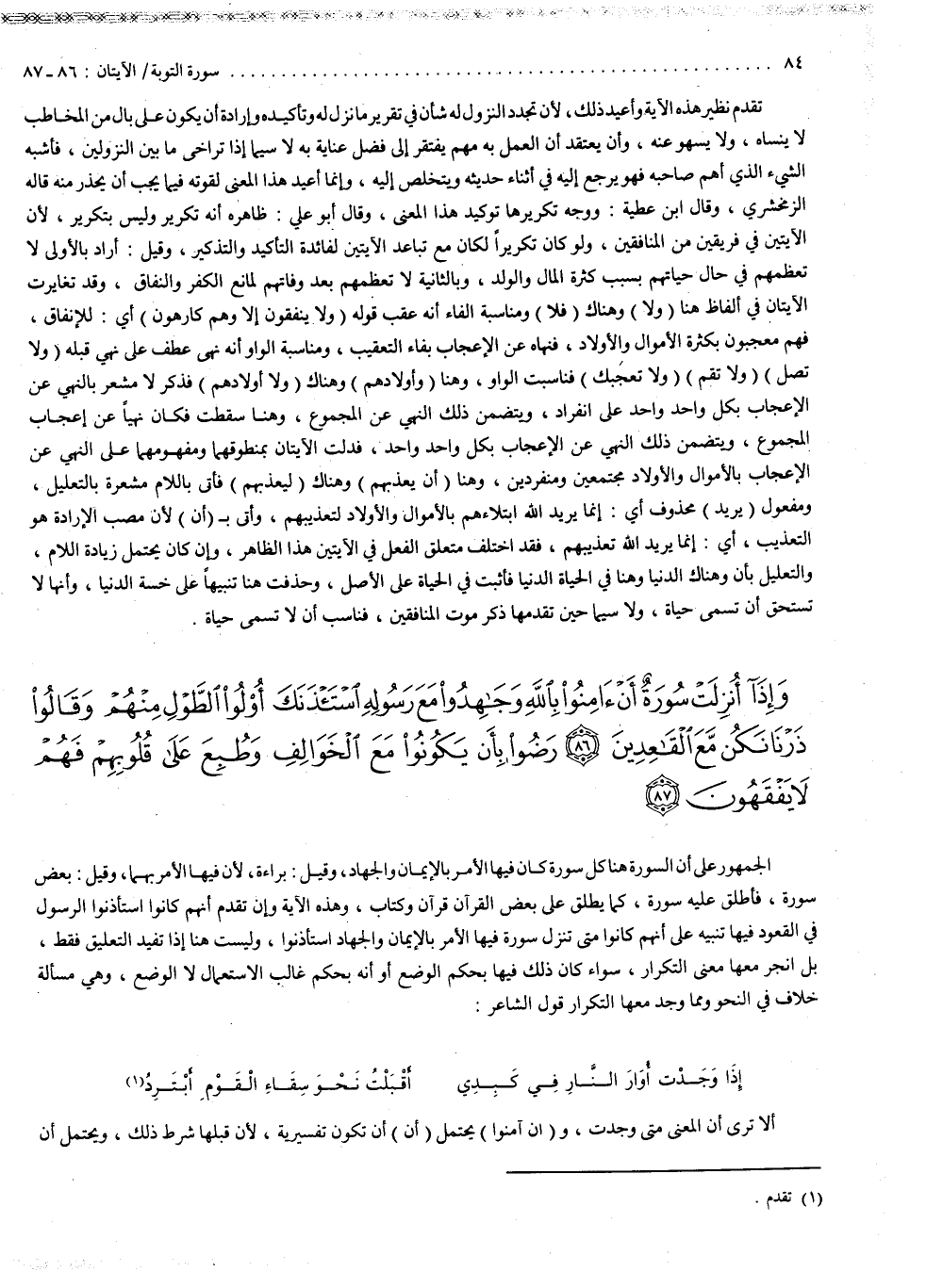 ( وَإِذَا أُنزِلَتْ سُورَةٌ أَنْ ءامِنُواْ بِاللَّهِ وَجَاهِدُواْ مَعَ رَسُولِهِ اسْتَأْذَنَكَ أُوْلُواْ الطَّوْلِ مِنْهُمْ وَقَالُواْ ذَرْنَا نَكُنْ مَّعَ الْقَاعِدِينَ رَضُواْ ( الجمهور على أنّ السورة هنا كل سورة كان فيها الأمر بالإيمان والجهاد . وقيل : براءة لأنّ فيها الأمر بهما . وقيل : بعض سورة ، فأطلق عليه سورة ، كما يطلق على بعض القرآن قرآن وكتاب . وهذه الآية وإن تقدم أنهم كانوا استأذنوا الرسول في القعود ، فيها تنبيه على أنهم كانوا متى تنزل سورة فيها الأمر بالإيمان والجهاد استأذنوا ، وليست هنا إذاً تفيد التعليق فقط ، بل انجرَّ معها معنى التكرار سواء كان ذلك فيها بحكم الوضع أنه بحكم غالب الاستعمال ، لا الوضع . وهي مسألة خلاف في النحو ، ومما وجد معها التكرار قول الشاعر : إذا وجدت أوار النار في كبدي
