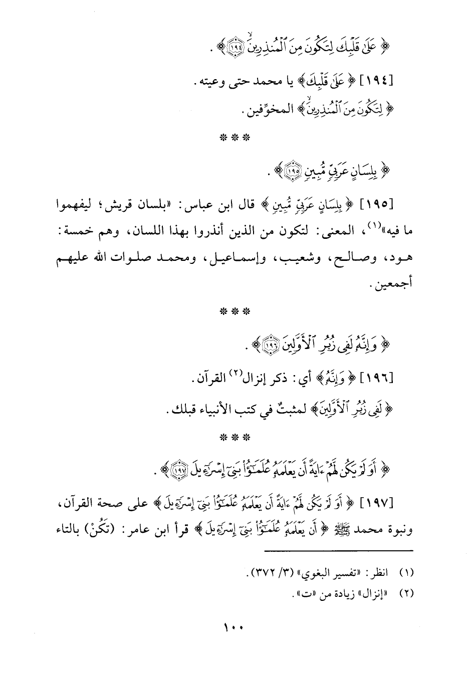 [195] {بِلِسَانٍ عَرَبِيٍّ مُبِينٍ} قال ابن عباس: "بلسان قريش؛ ليفهموا ما فيه" (¬1)، المعنى: لتكون من الذين أنذروا بهذا اللسان، وهم خمسة: هود، وصالح، وشعيب، وإسماعيل، ومحمد صلوات الله عليهم أجمعين.