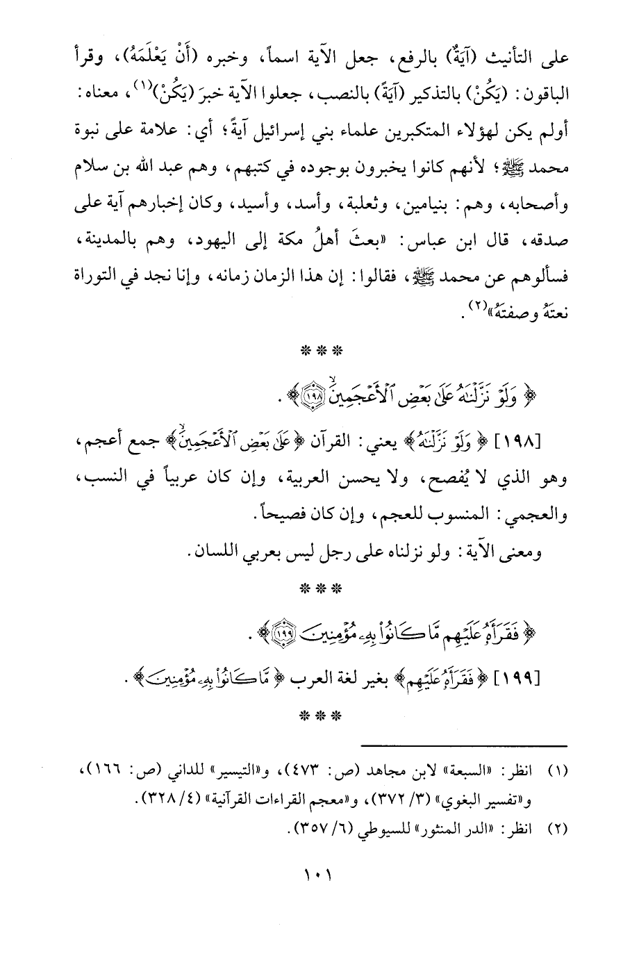 [198] {وَلَوْ نَزَّلْنَاهُ} يعني: القرآن {عَلَى بَعْضِ الْأَعْجَمِينَ} جمع أعجم، وهو الذي لا يُفصح، ولا يحسن العربية، وإن كان عربيًّا في النسب، والعجمي: المنسوب للعجم، وإن كان فصيحًا.