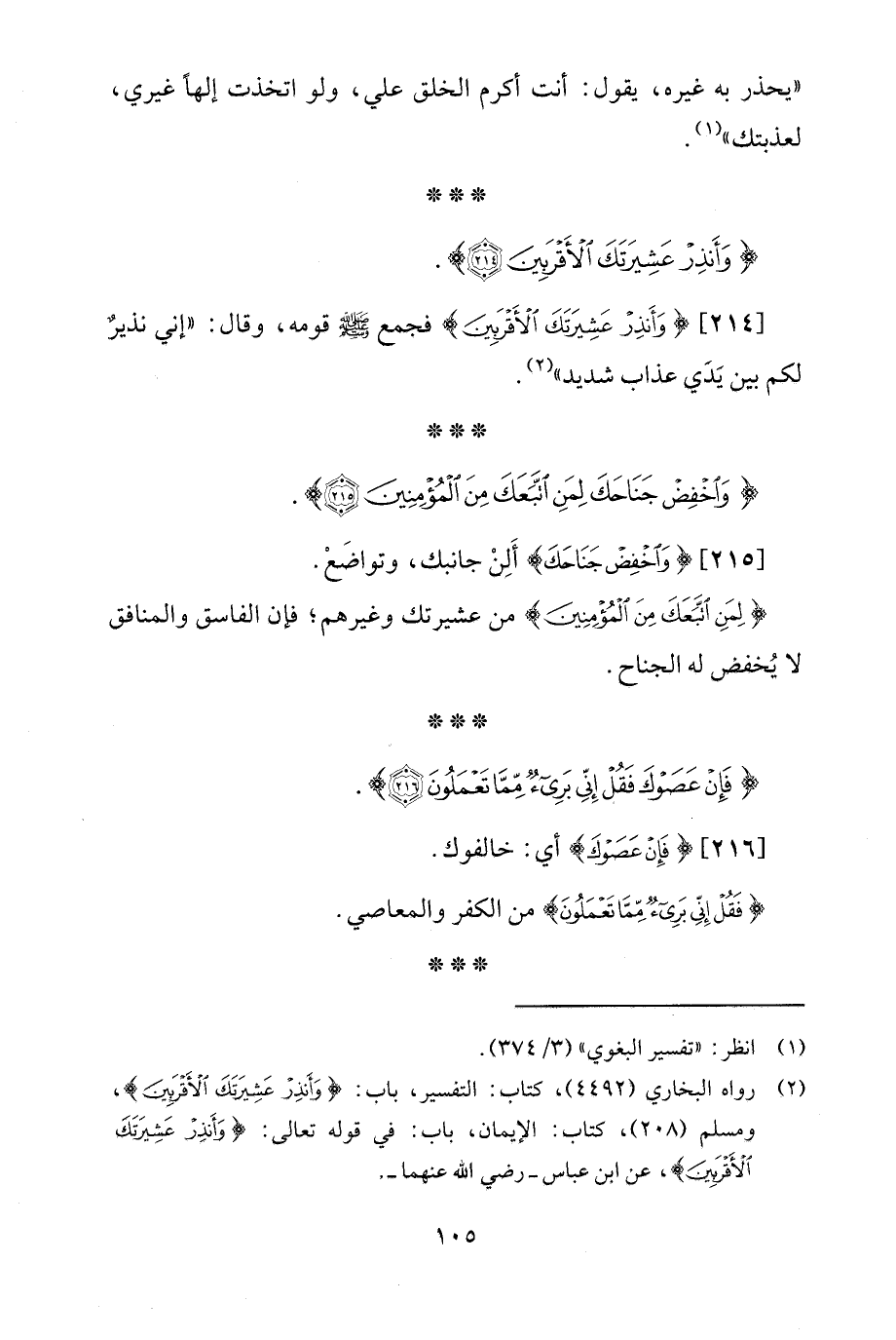 (¬2) رواه البخاري (4492)، كتاب: التفسير، باب: {وَأَنْذِرْ عَشِيرَتَكَ الْأَقْرَبِينَ}، ومسلم (208)، كتاب: الإيمان، باب: في قوله تعالى: {وَأَنْذِرْ عَشِيرَتَكَ الْأَقْرَبِينَ}، عن ابن عباس -رضي الله عنهما-.