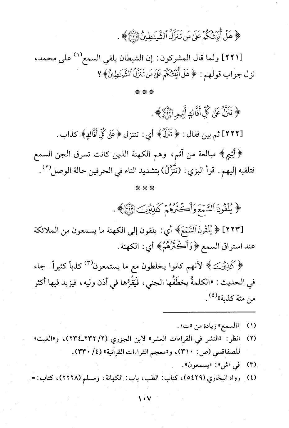 {أَثِيمٍ} مبالغة من آثم، وهم الكهنة الذين كانت تسرق الجن السمع فتلقيه إليهم. قرأ البزي: (تَّنزَّلُ) بتشديد التاء في الحرفين حالة الوصل (¬2).