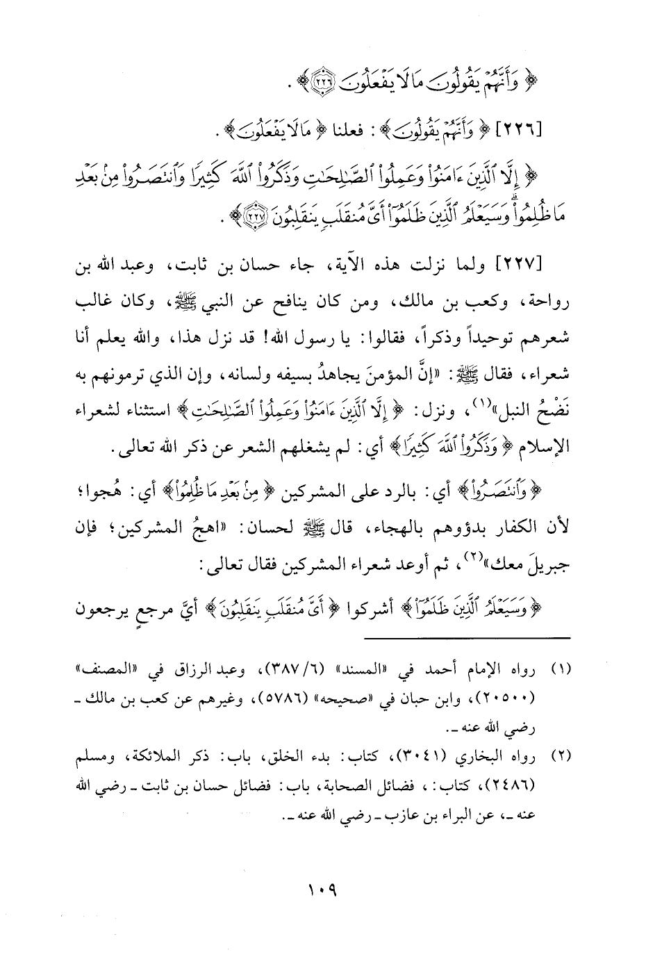 [227] ولما نزلت هذه الآية، جاء حسان بن ثابت، وعبد الله بن رواحة، وكعب بن مالك، ومن كان ينافح عن النبي - صلى الله عليه وسلم -، وكان غالب شعرهم توحيدًا وذكرًا، فقالوا: يا رسول الله! قد نزل هذا، والله يعلم أنا شعراء، فقال - صلى الله عليه وسلم -: "إنَّ المؤمنَ يجاهدُ بسيفه ولسانه، وإن الذي ترمونهم به نَضْحُ النبل" (¬1)، ونزل: {إِلَّا الَّذِينَ آمَنُوا وَعَمِلُوا الصَّالِحَاتِ} استثناء لشعراء الإسلام {وَذَكَرُوا اللَّهَ كَثِيرًا} أي: لم يشغلهم الشعر عن ذكر الله تعالى.