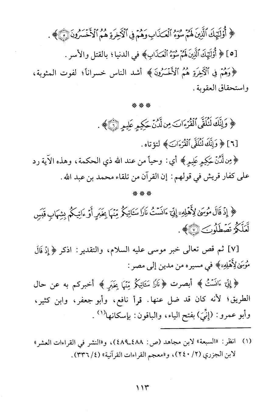 {إِذْ قَالَ مُوسَى لِأَهْلِهِ إِنِّي آنَسْتُ نَارًا سَآتِيكُمْ مِنْهَا بِخَبَرٍ أَوْ آتِيكُمْ بِشِهَابٍ قَبَسٍ لَعَلَّكُمْ تَصْطَلُونَ (7)}.