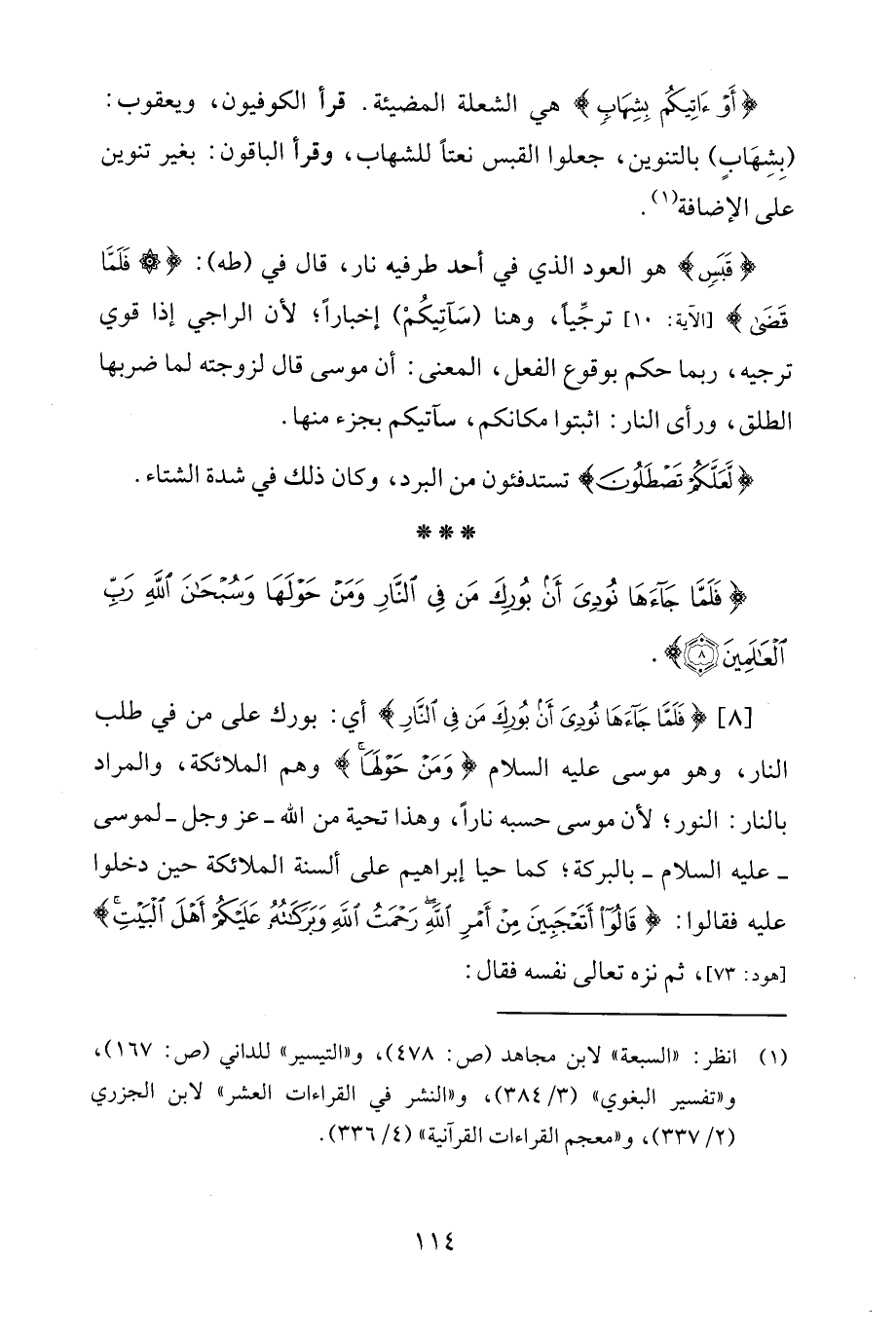 {أَوْ آتِيكُمْ بِشِهَابٍ} هي الشعلة المضيئة. قرأ الكوفيون، ويعقوب: (بِشِهَابٍ) بالتنوين، جعلوا القبس نعتًا للشهاب، وقرأ الباقون: بغير تنوين على الإضافة (¬1).