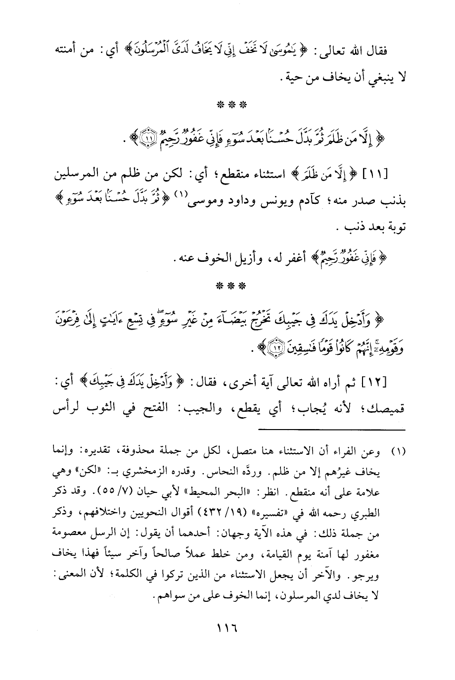 [11] {إِلَّا مَنْ ظَلَمَ} استثناء منقطع؛ أي: لكن من ظلم من المرسلين بذنب صدر منه؛ كآدم ويونس وداود وموسى (¬1) {ثُمَّ بَدَّلَ حُسْنًا بَعْدَ سُوءٍ} توبة بعد ذنب.