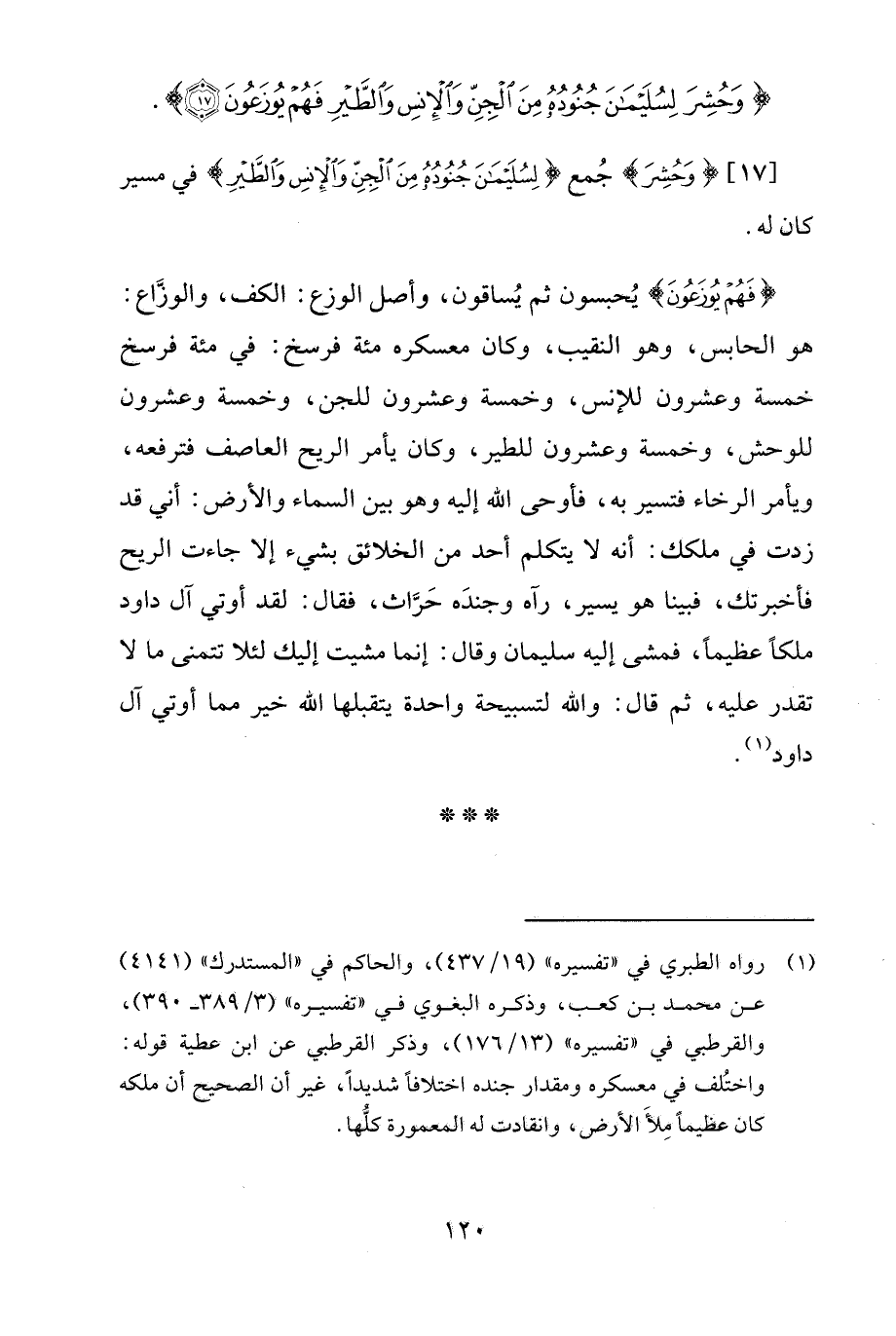 {فَهُمْ يُوزَعُونَ} يُحبسون ثم يُساقون، وأصل الوزع: الكف، والوزَّاع: هو الحابس، وهو النقيب، وكان معسكره مئة فرسخ: في مئة فرسخ خمسة وعشرون للإنس، وخمسة وعشرون للجن، وخمسة وعشرون للوحش، وخمسة وعشرون للطير، وكان يأمر الريح العاصف فترفعه، ويأمر الرخاء فتسير به، فأوحى الله إليه وهو بين السماء والأرض: أني قد زدت في ملكك: أنه لا يتكلم أحد من الخلائق بشيء إلا جاءت الريح فأخبرتك، فبينا هو يسير، رآه وجندَه حَرَّاث، فقال: لقد أوتي آل داود ملكًا عظيمًا، فمشى إليه سليمان وقال: إنما مشيت إليك لئلا تتمنى ما لا تقدر عليه، ثم قال: والله لتسبيحة واحدة يتقبلها الله خير مما أوتي آل داود (¬1).