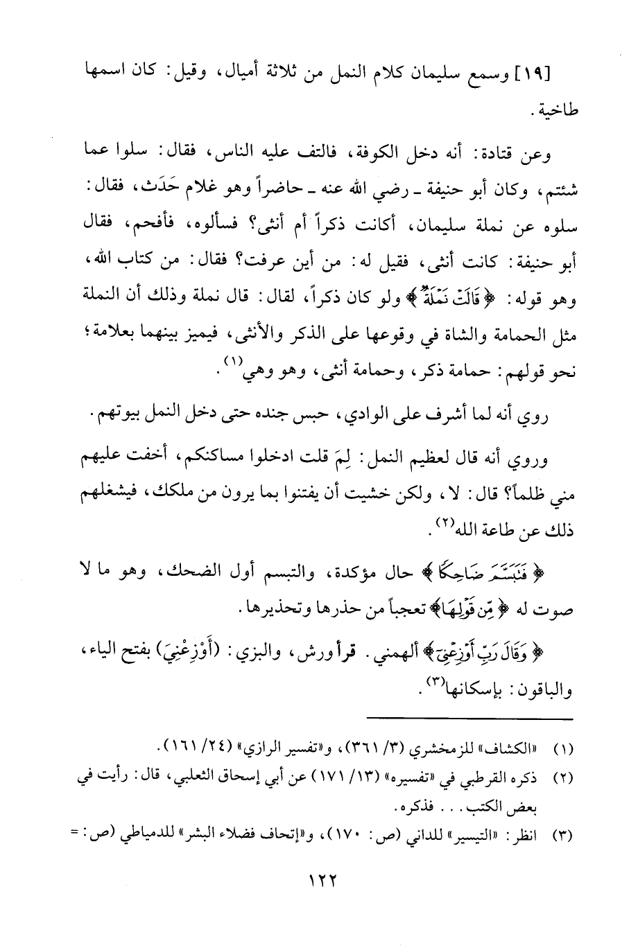 وعن قتادة: أنه دخل الكوفة، فالتف عليه الناس، فقال: سلوا عما شئتم، وكان أبو حنيفة -رضي الله عنه- حاضرًا وهو غلام حَدَث، فقال: سلوه عن نملة سليمان، أكانت ذكرًا أم أنثى؟ فسألوه، فأفحم، فقال أبو حنيفة: كانت أنثى، فقيل له: من أين عرفت؟ فقال: من كتاب الله، وهو قوله: {قَالَتْ نَمْلَةٌ} ولو كان ذكرًا، لقال: قال نملة وذلك أن النملة مثل الحمامة والشاة في وقوعها على الذكر والأنثى، فيميز بينهما بعلامة؛ نحو قولهم: حمامة ذكر، وحمامة أنثى، وهو وهي (¬1).