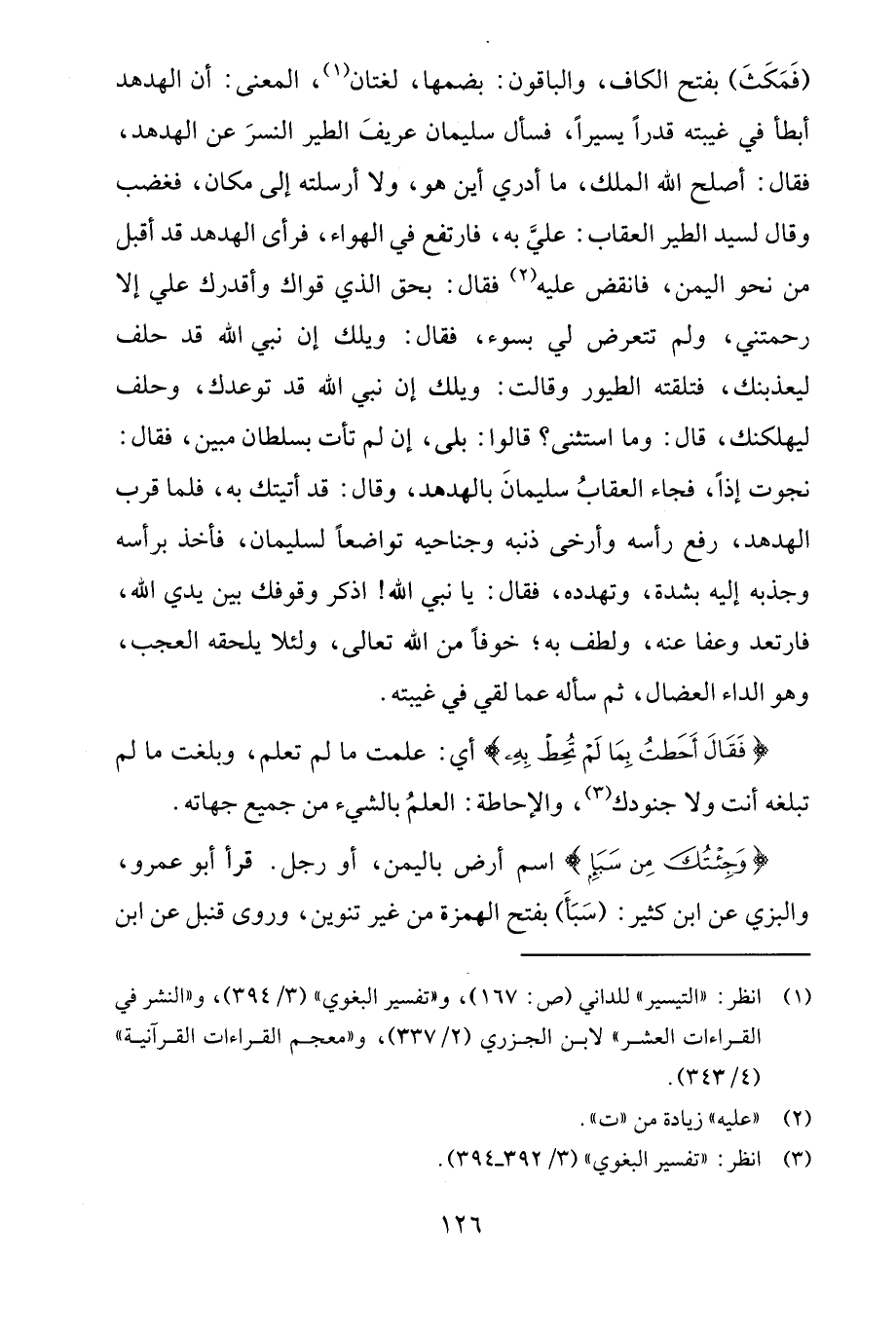 (فَمَكَثَ) بفتح الكاف، والباقون: بضمها، لغتان (¬1)، المعنى: أن الهدهد أبطأ في غيبته قدرًا يسيرًا، فسأل سليمان عريفَ الطير النسرَ عن الهدهد، فقال: أصلح الله الملك، ما أدري أين هو، ولا أرسلته إلى مكان، فغضب وقال لسيد الطير العقاب: عليَّ به، فارتفع في الهواء، فرأى الهدهد قد أقبل من نحو اليمن، فانقض عليه (¬2) فقال: بحق الذي قواك وأقدرك علي إلا رحمتني، ولم تتعرض لي بسوء، فقال: ويلك إن نبي الله قد حلف ليعذبنك، فتلقته الطيور وقالت: ويلك إن نبي الله قد توعدك، وحلف ليهلكنك، قال: وما استثنى؟ قالوا: بلى، إن لم تأت بسلطان مبين، فقال: نجوت إذًا، فجاء العقابُ سليمانَ بالهدهد، وقال: قد أتيتك به، فلما قرب الهدهد، رفع رأسه وأرخى ذنبه وجناحيه تواضعًا لسليمان، فأخذ برأسه وجذبه إليه بشدة، وتهدده، فقال: يا نبي الله! اذكر وقوفك بين يدي الله، فارتعد وعفا عنه، ولطف به؛ خوفًا من الله تعالى، ولئلا يلحقه العجب، وهو الداء العضال، ثم سأله عما لقي في غيبته.