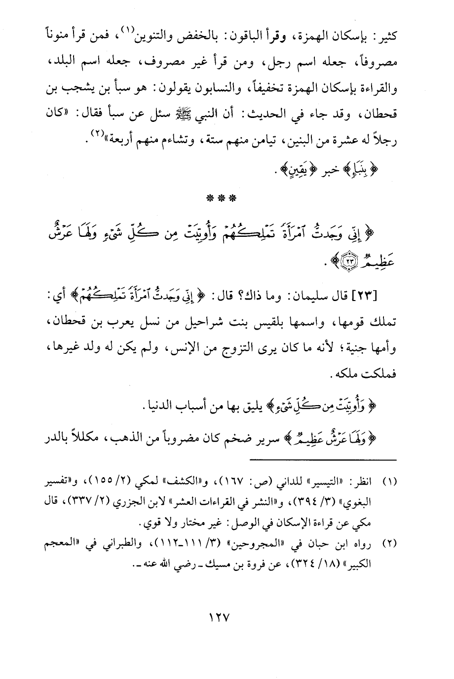 [23] قال سليمان: وما ذاك؟ قال: {إِنِّي وَجَدْتُ امْرَأَةً تَمْلِكُهُمْ} أي: تملك قومها، واسمها بلقيس بنت شراحيل من نسل يعرب بن قحطان، وأمها جنية؛ لأنه ما كان يرى التزوج من الإنس، ولم يكن له ولد غيرها، فملكت ملكه.