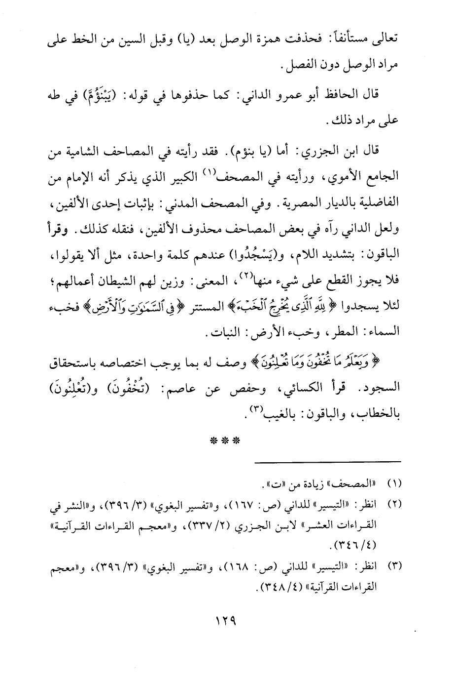 قال ابن الجزري: أما (يا بنؤم). فقد رأيته في المصاحف الشامية من الجامع الأموي، ورأيته في المصحف (¬1) الكبير الذي يذكر أنه الإمام من الفاضلية بالديار المصرية. وفي المصحف المدني: بإثبات إحدى الألفين، ولعل الداني رآه في بعض المصاحف محذوف الألفين، فنقله كذلك. وقرأ الباقون: بتشديد اللام، و (يَسْجُدُوا) عندهم كلمة واحدة، مثل ألا يقولوا، فلا يجوز القطع على شيء منها (¬2)، المعنى: وزين لهم الشيطان أعمالهم؛ لئلا يسجدوا {لِلَّهِ الَّذِي يُخْرِجُ الْخَبْءَ} المستتر {فِي السَّمَاوَاتِ وَالْأَرْضِ} فخبء السماء: المطر، وخبء الأرض: النبات.