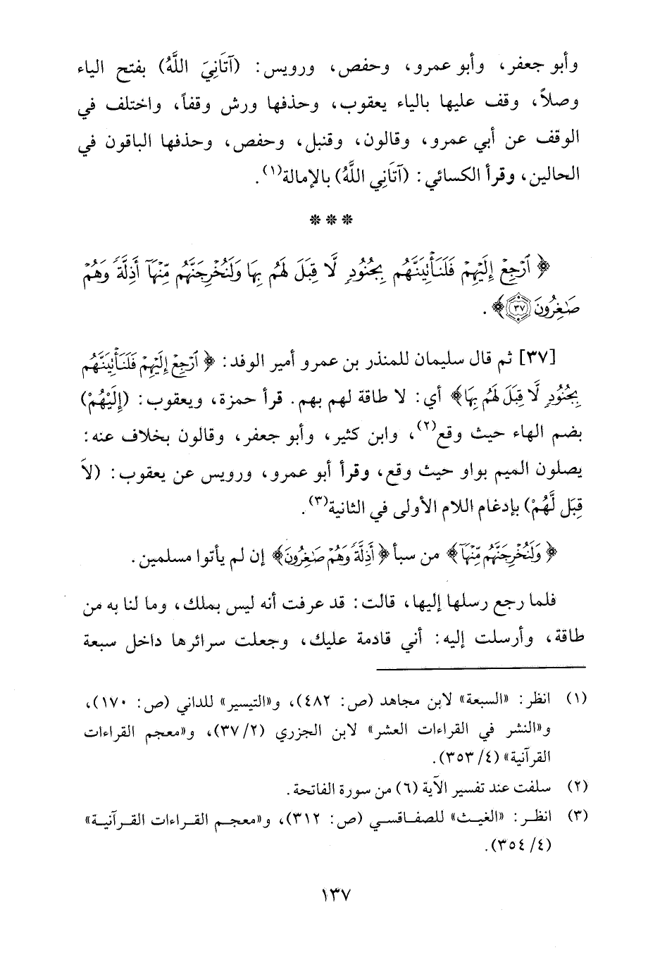 [37] ثم قال سليمان للمنذر بن عمرو أمير الوفد: {ارْجِعْ إِلَيْهِمْ فَلَنَأْتِيَنَّهُمْ بِجُنُودٍ لَا قِبَلَ لَهُمْ بِهَا} أي: لا طاقة لهم بهم. قرأ حمزة، ويعقوب: (إِلَيْهمْ) بضم الهاء حيث وقع (¬2)، وابن كثير، وأبو جعفر، وقالون بخلاف عنه: يصلون الميم بواو حيث وقع، وقرأ أبو عمرو، ورويس عن يعقوب: (لاَ قِبَل لَّهُمْ) بإدغام اللام الأولى في الثانية (¬3).