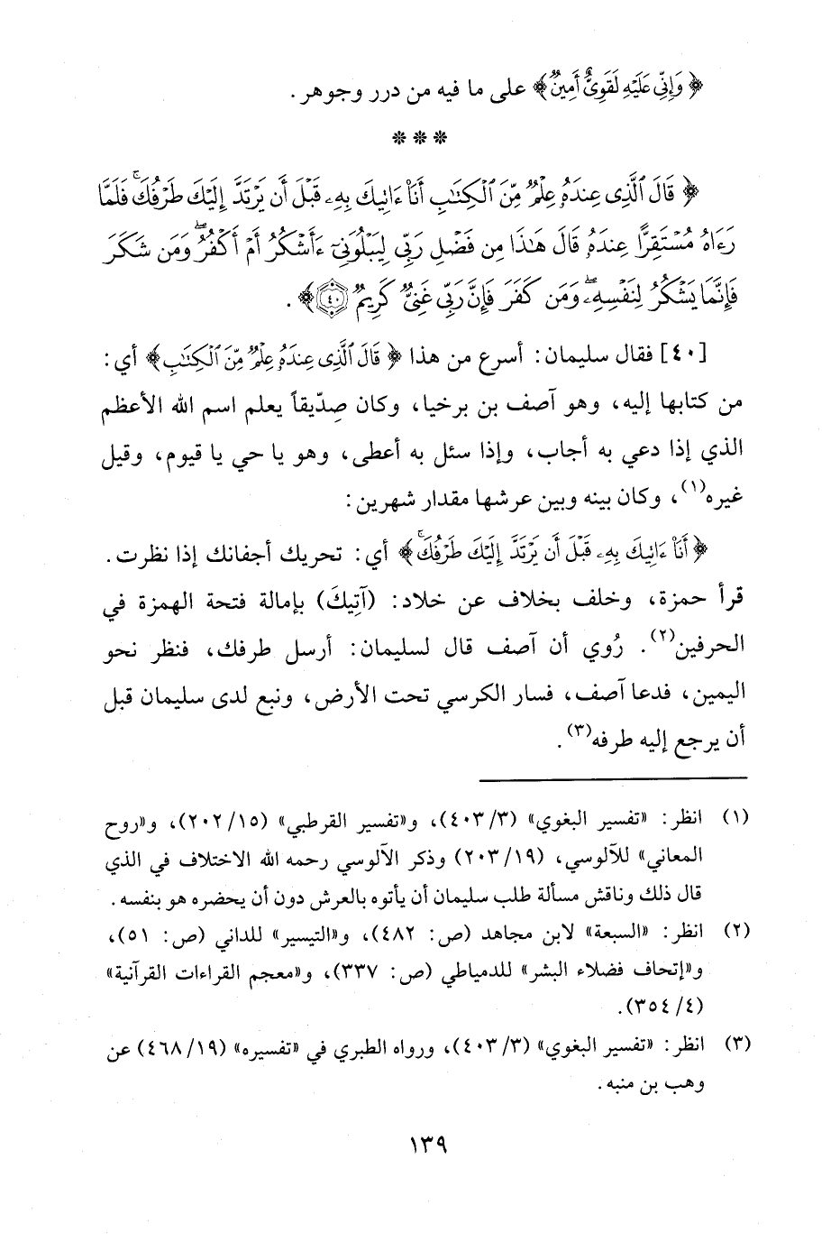 (¬1) انظر: "تفسير البغوي" (3/ 403)، و"تفسير القرطبي" (15/ 202)، و"روح المعاني" للآلوسي، (19/ 203) وذكر الآلوسي رحمه الله الاختلاف في الذي قال ذلك وناقش مسألة طلب سليمان أن يأتوه بالعرش دون أن يحضره هو بنفسه.