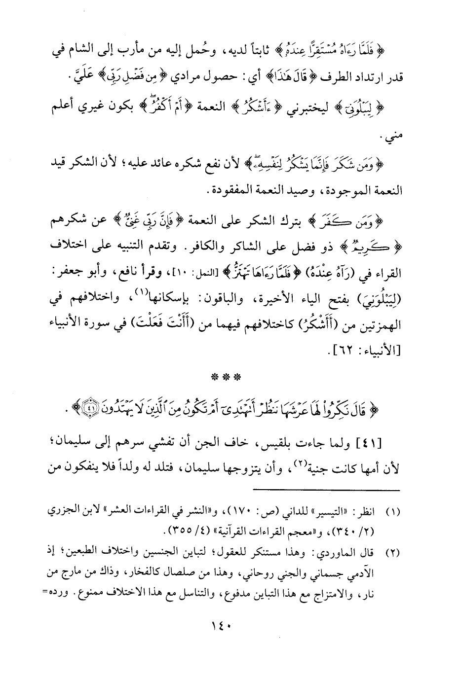 {وَمَنْ كَفَرَ} بترك الشكر على النعمة {فَإِنَّ رَبِّي غَنِيٌّ} عن شكرهم {كَرِيمٌ} ذو فضل على الشاكر والكافر. وتقدم التنبيه على اختلاف القراء في (رَآهُ عِنْدَهُ) {فَلَمَّا رَآهَا تَهْتَزُّ} [النمل: 10]، وقرأ نافع، وأبو جعفر: (لِيَبْلُوَنيَ) بفتح الياء الأخيرة، والباقون: بإسكانها (¬1)، واختلافهم في الهمزتين من (أَأَشْكُرُ) كاختلافهم فيهما من (أَأَنْتَ فَعَلْتَ) في سورة الأنبياء [الأنبياء: 62].