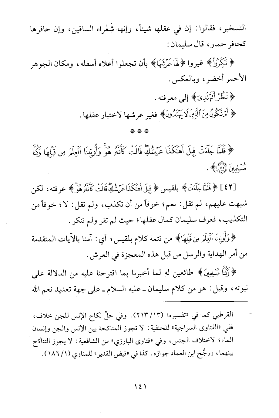 [42] {فَلَمَّا جَاءَتْ} بلقيس {قِيلَ أَهَكَذَا عَرْشُكِ قَالَتْ كَأَنَّهُ هُوَ} عرفته، لكن شبهت عليهم، لم تقل: نعم؛ خوفًا من أن تكذب، ولم تقل: لا؛ خوفًا من التكذيب، فعرف سليمان كمال عقلها؛ حيث لم تقر ولم تنكر.