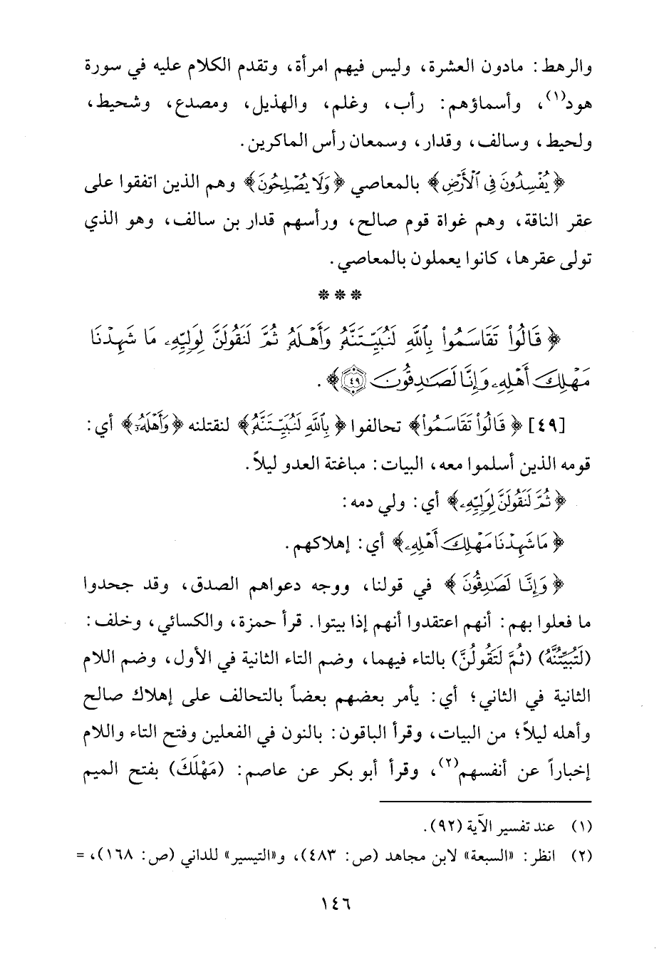 {وَإِنَّا لَصَادِقُونَ} في قولنا، ووجه دعواهم الصدق، وقد جحدوا ما فعلوا بهم: أنهم اعتقدوا أنهم إذا بيتوا. قرأ حمزة، والكسائي، وخلف: (لَتُبَيِّتُنَّهُ) (ثُمَّ لَتَقُولُنَّ) بالتاء فيهما، وضم التاء الثانية في الأول، وضم اللام الثانية في الثاني؛ أي: يأمر بعضهم بعضًا بالتحالف على إهلاك صالح وأهله ليلًا؛ من البيات، وقرأ الباقون: بالنون في الفعلين وفتح التاء واللام إخبارًا عن أنفسهم (¬2)، وقرأ أبو بكر عن عاصم: (مَهْلَكَ) بفتح الميم