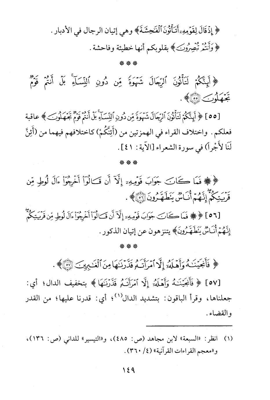 [55] {أَئِنَّكُمْ لَتَأْتُونَ الرِّجَالَ شَهْوَةً مِنْ دُونِ النِّسَاءِ بَلْ أَنْتُمْ قَوْمٌ تَجْهَلُونَ} عاقبة فعلكم. واختلاف القراء في الهمزتين من (أَئِنَّكُمْ) كاختلافهم فيهما من (أَئِنَّ لَنَا لأَجْرًا) في سورة الشعراء [الآية: 41].