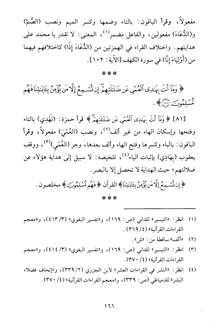 [81] {وَمَا أَنْتَ بِهَادِي الْعُمْيِ عَنْ ضَلَالَتِهِمْ} قرأ حمزة: (تَهْدِي) بالتاء وفتحها وإسكان الهاء من غير ألف (¬2)، ونصب (العُمْيَ) مفعولًا، وقرأ الباقون: بالباء وكسرها وفتح الهاء وألف بعدها، وجر (العُمْيِ) (¬3)، ووقف يعقوب (بِهَادِي) بإثبات الياء (¬4)، تلخيصه: لا سبيل إلى هداية هؤلاء عن ضلالتهم؛ حيث الهداية لا تحصل إلا بالبصر.