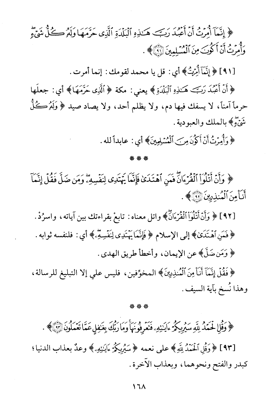 {إِنَّمَا أُمِرْتُ أَنْ أَعْبُدَ رَبَّ هَذِهِ الْبَلْدَةِ الَّذِي حَرَّمَهَا وَلَهُ كُلُّ شَيْءٍ وَأُمِرْتُ أَنْ أَكُونَ مِنَ الْمُسْلِمِينَ (91)}.