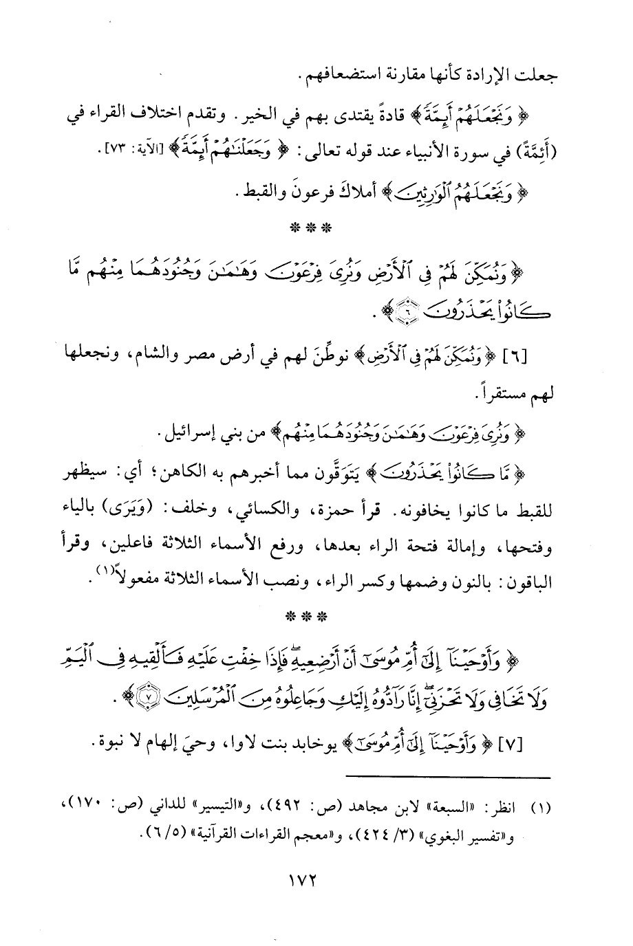{مَا كَانُوا يَحْذَرُونَ} يَتَوَقَّون مما أخبرهم به الكاهن؛ أي: سيظهر للقبط ما كانوا يخافونه. قرأ حمزة، والكسائي، وخلف: (وَيَرَى) بالياء وفتحها، وإمالة فتحة الراء بعدها، ورفع الأسماء الثلاثة فاعلين، وقرأ الباقون: بالنون وضمها وكسر الراء، ونصب الأسماء الثلاثة مفعولًا (¬1).
