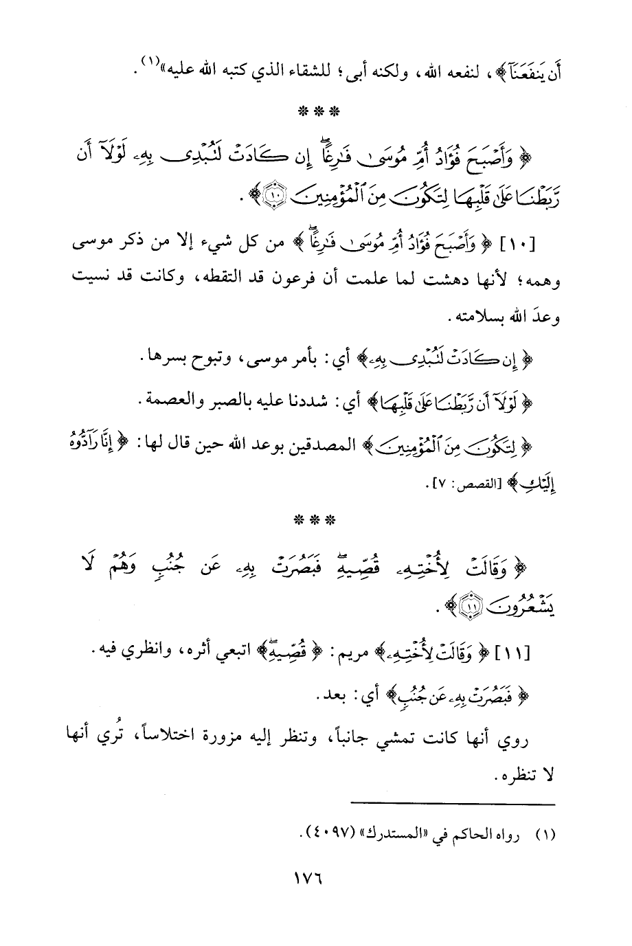 {وَأَصْبَحَ فُؤَادُ أُمِّ مُوسَى فَارِغًا إِنْ كَادَتْ لَتُبْدِي بِهِ لَوْلَا أَنْ رَبَطْنَا عَلَى قَلْبِهَا لِتَكُونَ مِنَ الْمُؤْمِنِينَ (10)}.