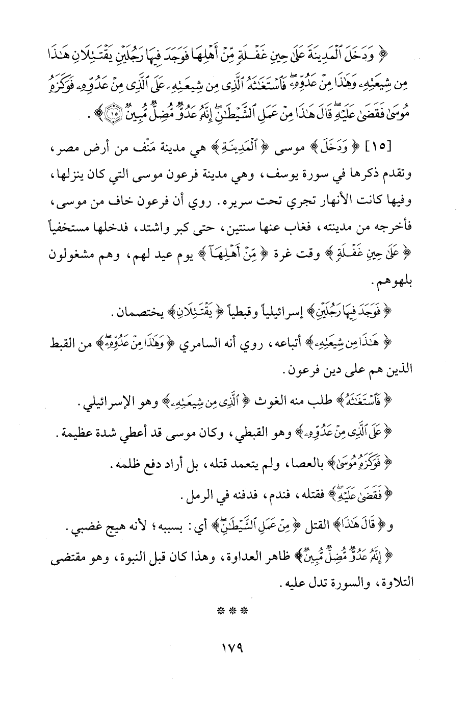 [15] {وَدَخَلَ} موسى {الْمَدِينَةَ} هي مدينة مَنْف من أرض مصر، وتقدم ذكرها في سورة يوسف، وهي مدينة فرعون موسى التي كان ينزلها، وفيها كانت الأنهار تجري تحت سريره. روي أن فرعون خاف من موسى، فأخرجه من مدينته، فغاب عنها سنتين، حتى كبر واشتد، فدخلها مستخفيًا {عَلَى حِينِ غَفْلَةٍ} وقت غرة {مِنْ أَهْلِهَا} يوم عيد لهم، وهم مشغولون بلهوهم.