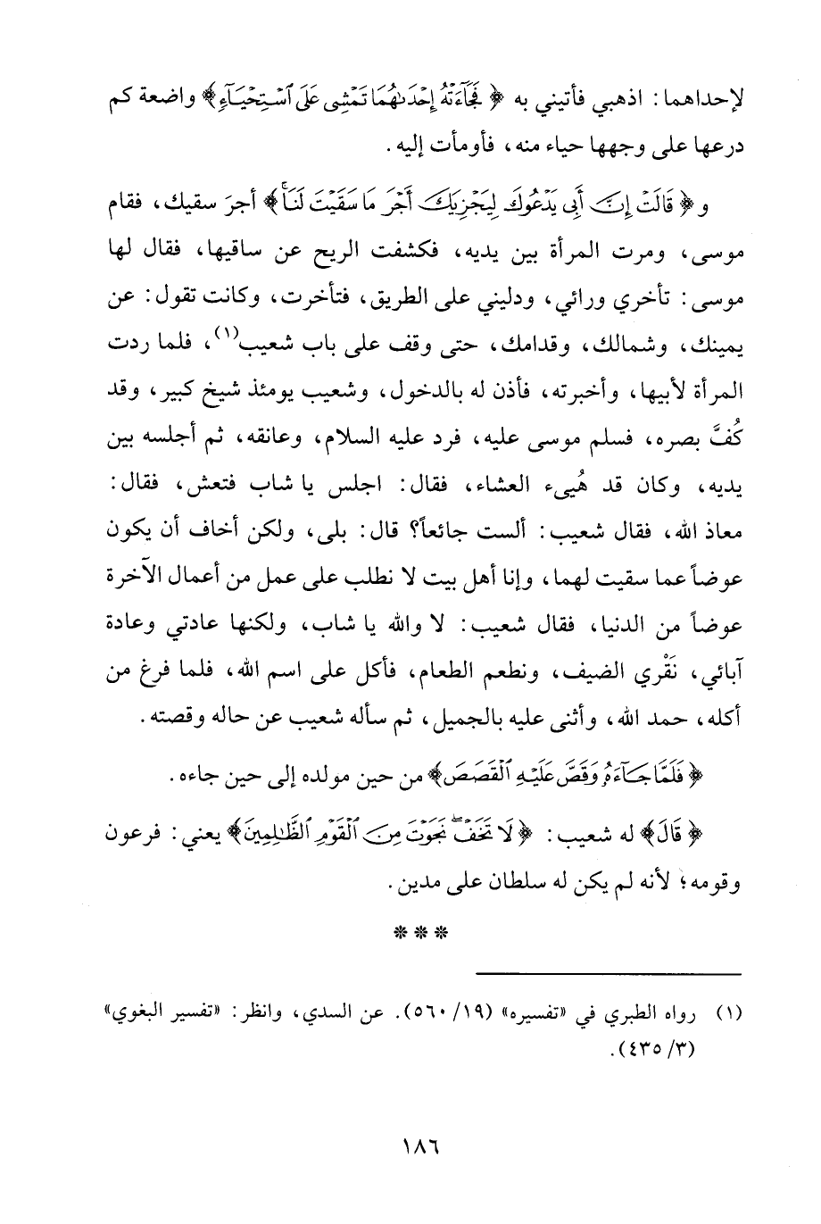 {قَالَتْ إِنَّ أَبِي يَدْعُوكَ لِيَجْزِيَكَ أَجْرَ مَا سَقَيْتَ لَنَا} أجرَ سقيك، فقام موسى، ومرت المرأة بين يديه، فكشفت الريح عن ساقيها، فقال لها موسى: تأخري ورائي، ودليني على الطريق، فتأخرت، وكانت تقول: عن يمينك، وشمالك، وقدامك، حتى وقف على باب شعيب (¬1)، فلما ردت المرأة لأبيها، وأخبرته، فأذن له بالدخول، وشعيب يومئذ شيخ كبير، وقد كُفَّ بصره، فسلم موسى عليه، فرد عليه السلام، وعانقه، ثم أجلسه بين يديه، وكان قد هُيئ العشاء، فقال: اجلس يا شاب فتعش، فقال: معاذ الله، فقال شعيب: ألست جائعًا؟ قال: بلى، ولكن أخاف أن يكون عوضًا عما سقيت لهما، وإنا أهل بيت لا نطلب على عمل من أعمال الآخرة عوضًا من الدنيا، فقال شعيب: لا والله يا شاب، ولكنها عادتي وعادة آبائي، نَقْري الضيف، ونطعم الطعام، فأكل على اسم الله، فلما فرغ من أكله، حمد الله، وأثنى عليه بالجميل، ثم سأله شعيب عن حاله وقصته.