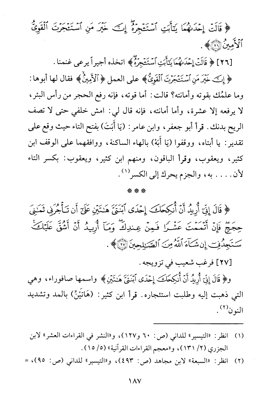 و {قَالَ إِنِّي أُرِيدُ أَنْ أُنْكِحَكَ إِحْدَى ابْنَتَيَّ هَاتَيْنِ} واسمها صافوراء، وهي التي ذهبت إليه وطلبت استئجاره. قرأ ابن كثير: (هَاتينِّ) بالمد وتشديد النون (¬2).