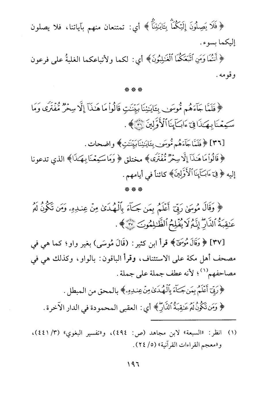 [37] {وَقَالَ مُوسَى} قرأ ابن كثير: (قَالَ مُوسَى) بغير واو؛ كما هي في مصحف أهل مكة على الاستئناف، وقرأ الباقون: بالواو، وكذلك هي في مصاحفهم (¬1)؛ لأنه عطف جملة على جملة.