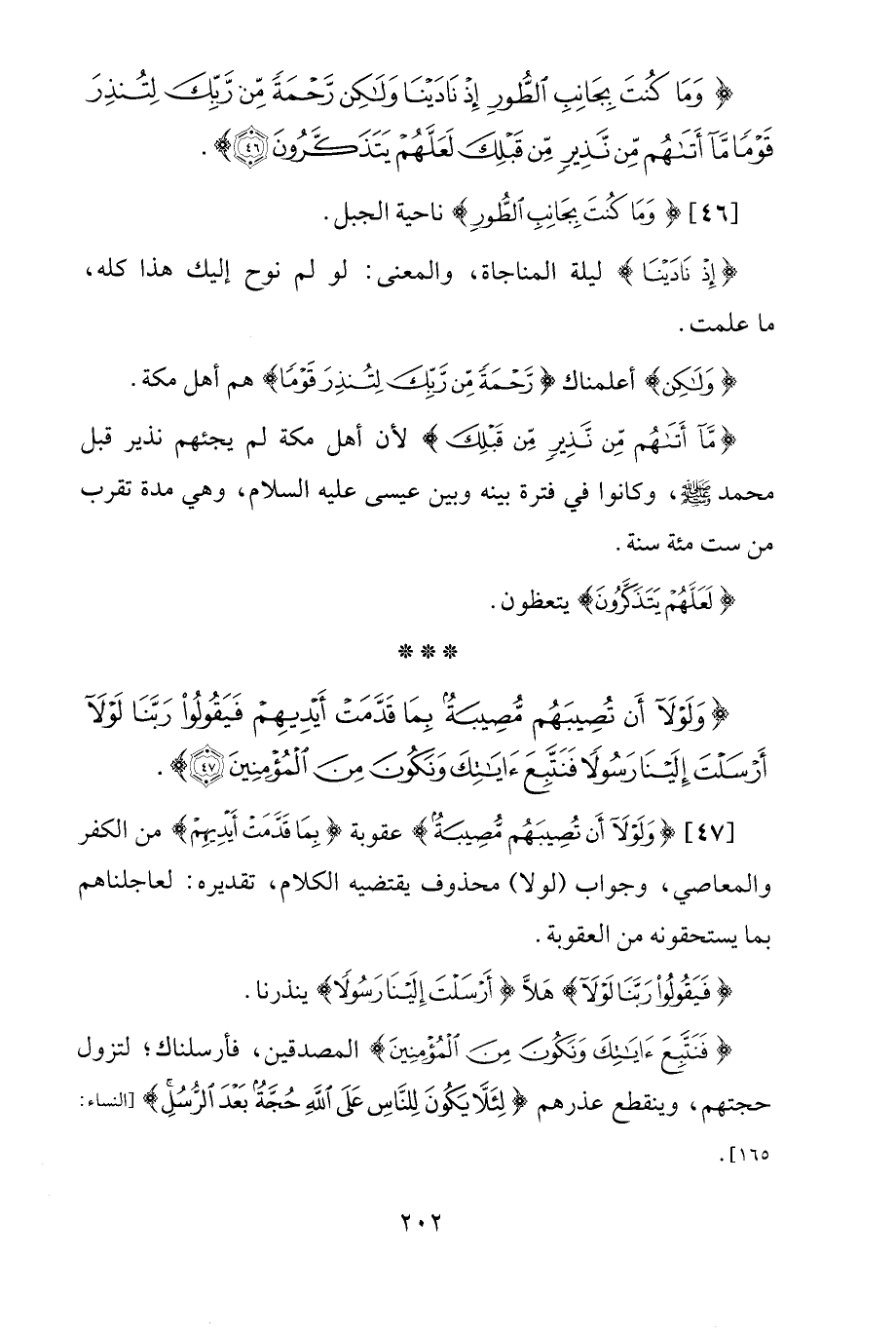 {وَلَوْلَا أَنْ تُصِيبَهُمْ مُصِيبَةٌ بِمَا قَدَّمَتْ أَيْدِيهِمْ فَيَقُولُوا رَبَّنَا لَوْلَا أَرْسَلْتَ إِلَيْنَا رَسُولًا فَنَتَّبِعَ آيَاتِكَ وَنَكُونَ مِنَ الْمُؤْمِنِينَ (47)}.